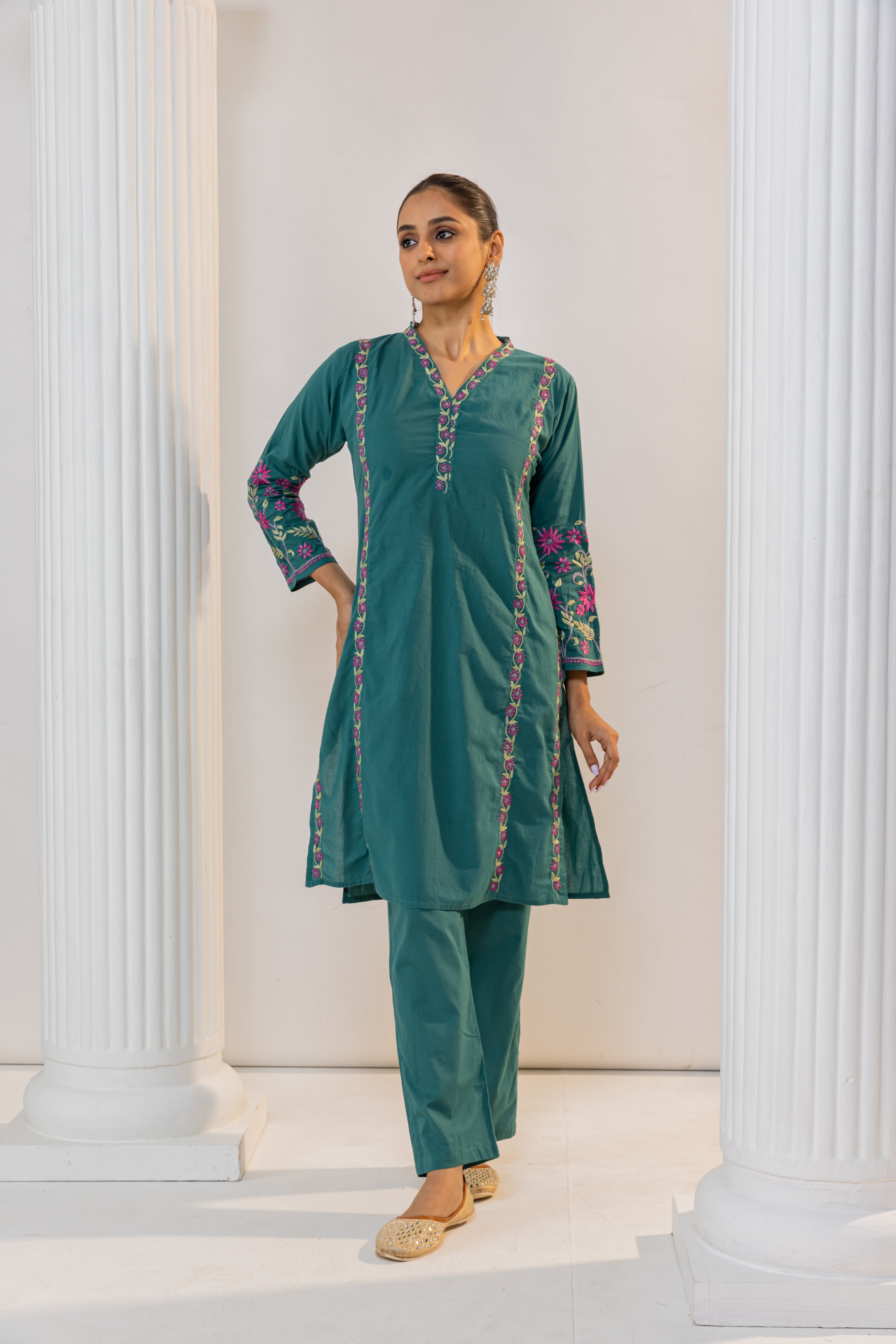 Wearing a straight Chikankari Co-ord set with pants is an easy choice for days when you do not feel like making an effort to look put-together. This go-to ensemble is perfect for days when you want to appear well-dressed, whether celebrating Eid at home or with friends. This pine-green Eid special Co-ord set will turn a lot of heads.