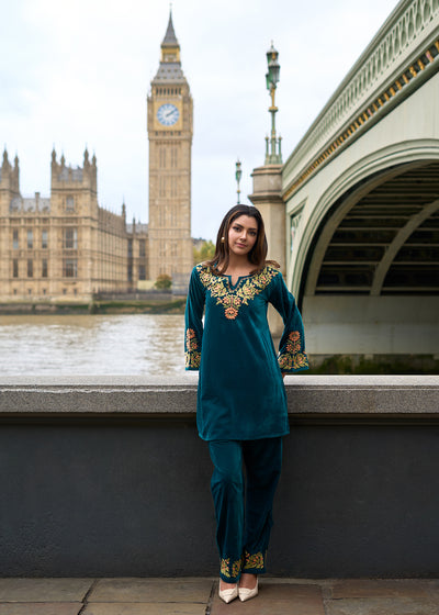 If lehengas are not your A-game, we recommend you to wear the gorgeous velvet kurta sets. Go from princess to queen-like look without any hassle! House of Kari presents to you a collection of embroidered velvet kurta set online. Whether you are looking for a neutral-hued or royal blue velvet kurta set, we have different colors for different occasions.