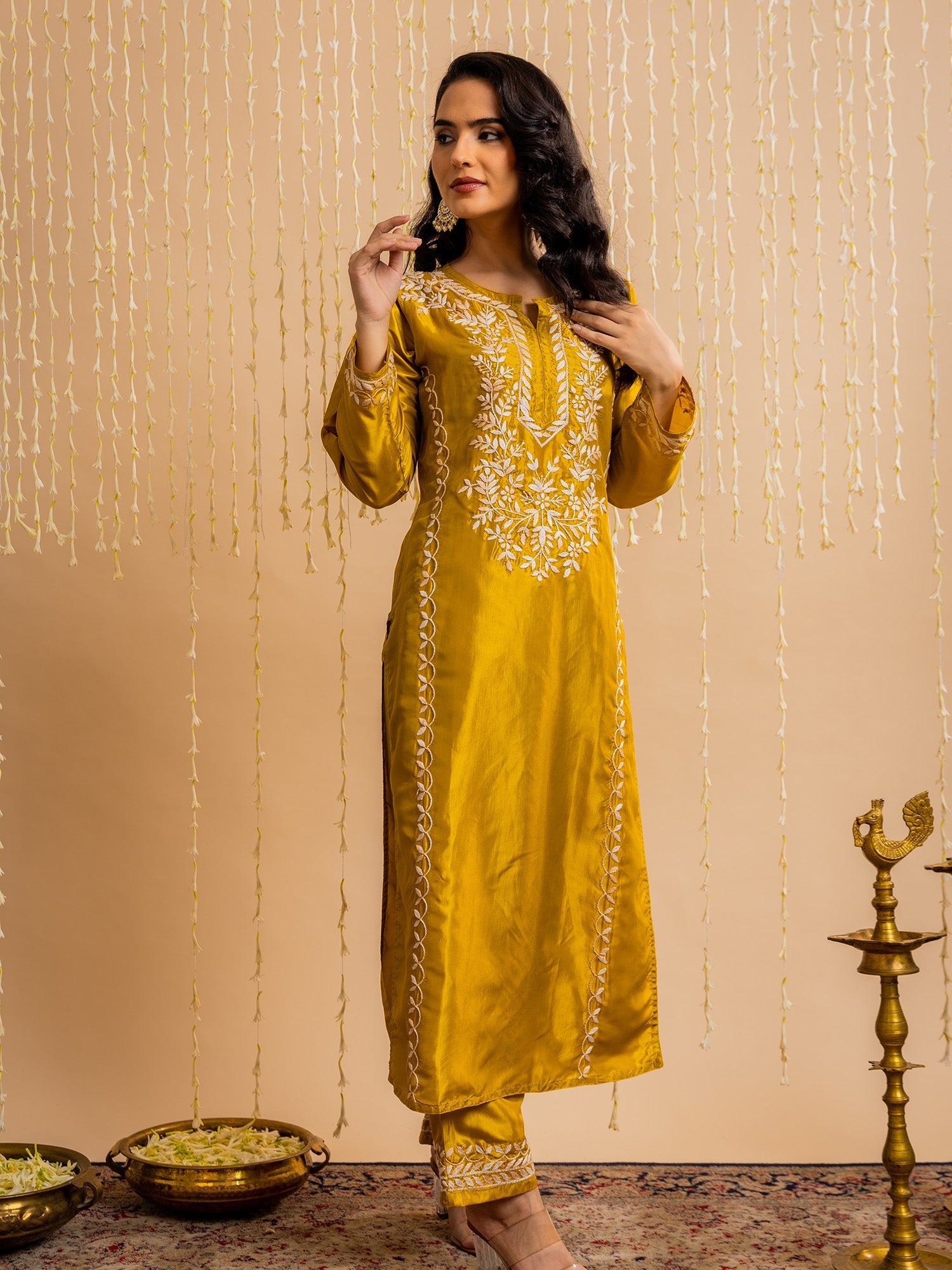 How can we miss Dandiya and Garba nights in Navratri? Pairing a long Chikankari kurti with a lehenga or a skirt is perfect for all your dandiya and garba nights. The Chikankari Silk Kurta Set is great for your body and for events that require a lot of activity to be able to give you the benefit of comfort.