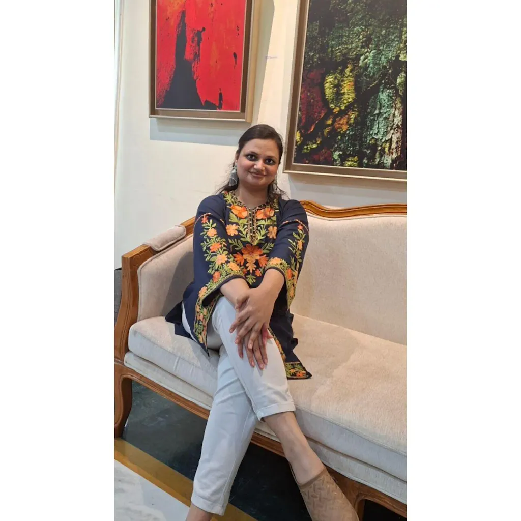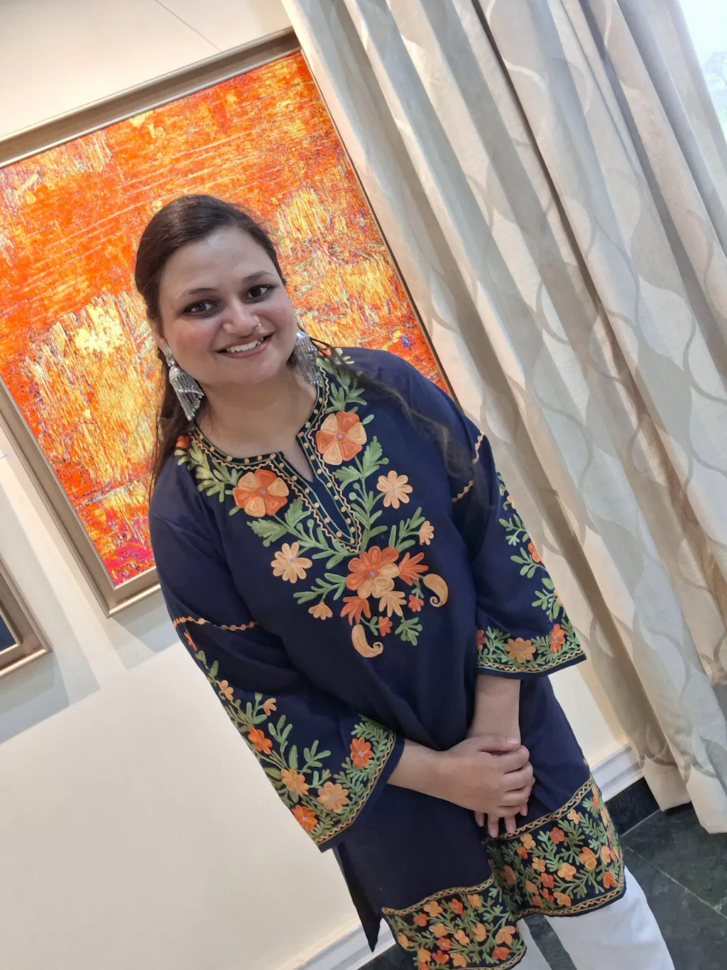 Elegant and effortlessly wearable, this navy blue kurta is crafted in breathable cotton, making it perfect for everyday ethnic dressing. The kurta features intricate Kashmiri Aari embroidery with floral motifs in warm mustard, orange, and leafy green tones, beautifully highlighted around the neckline, sleeves, and hemline.