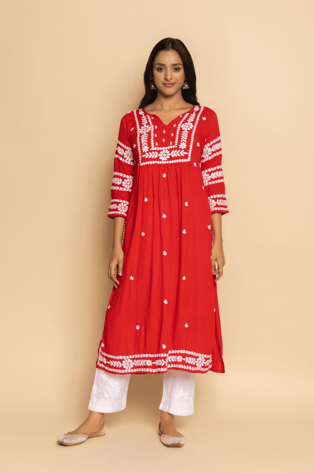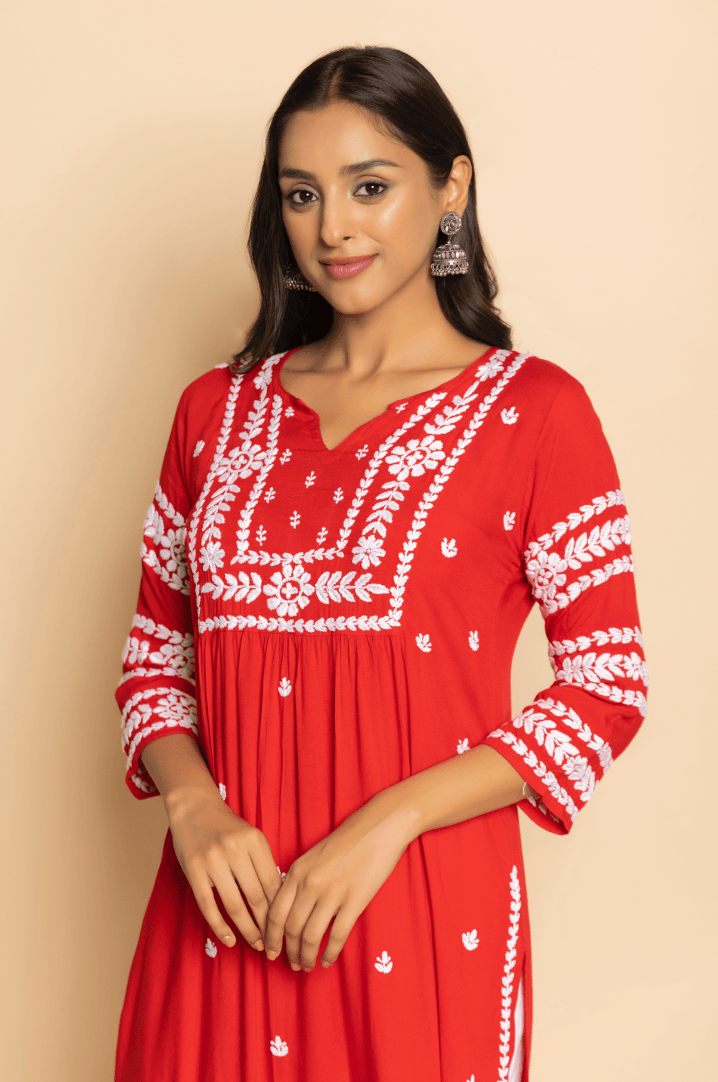 Valentine’s Day fashion is all about striking the perfect balance between romantic and stylish. While classic red chikankari kurta choices remain timeless, pastel hues, floral embroidery, and handcrafted designs are making a statement this season. Flowy womens valentines dress options featuring delicate chikankari embroidery, lace details, and soft fabrics like cotton and georgette ensure comfort and sophistication. Whether you prefer a traditional lucknowi kurta set for women or a contemporary printed valentines kurta, there is something for every style preference.