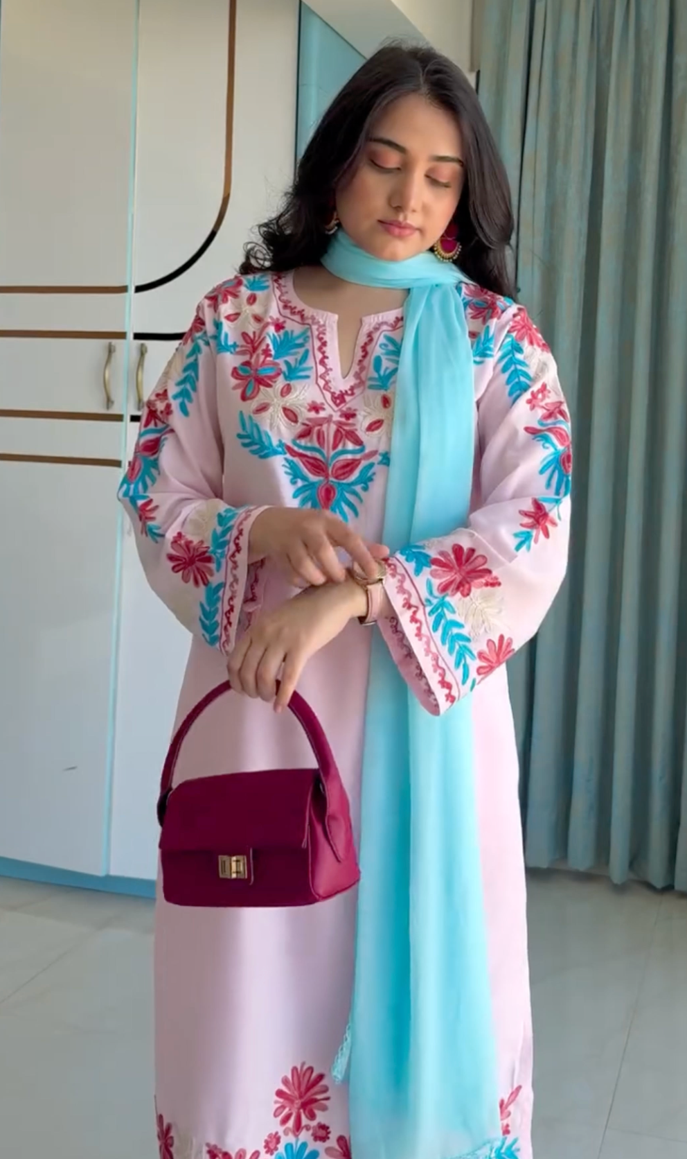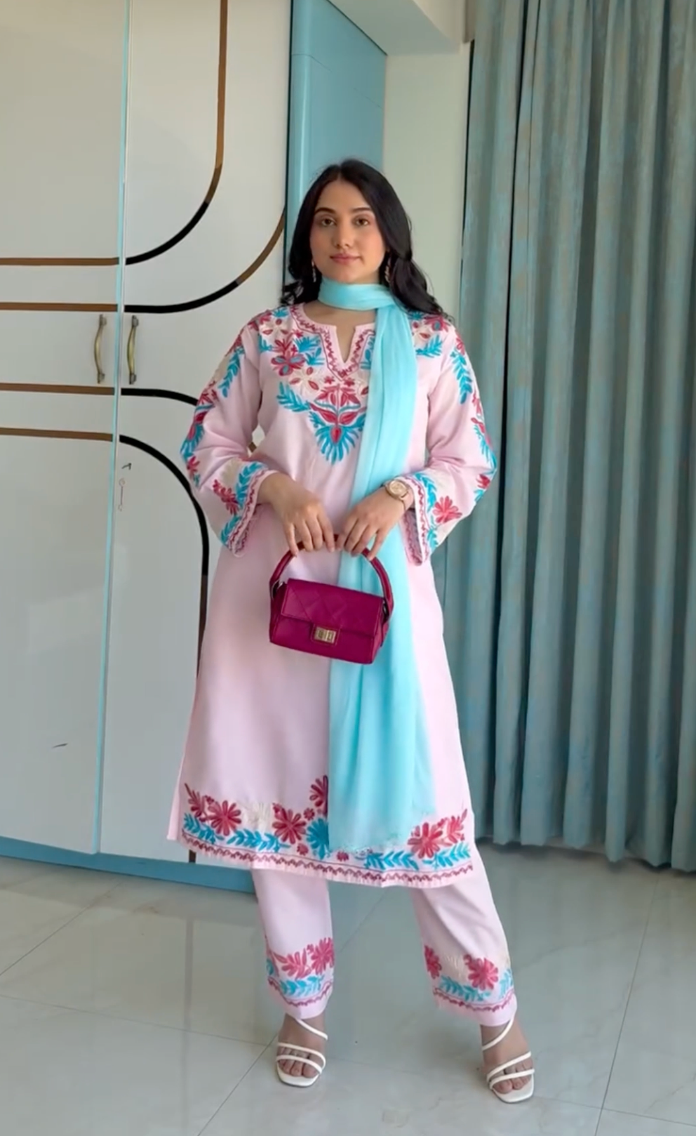 Asfi Javed in Falak Kashmiri Long Kurta Set - Baby Pink