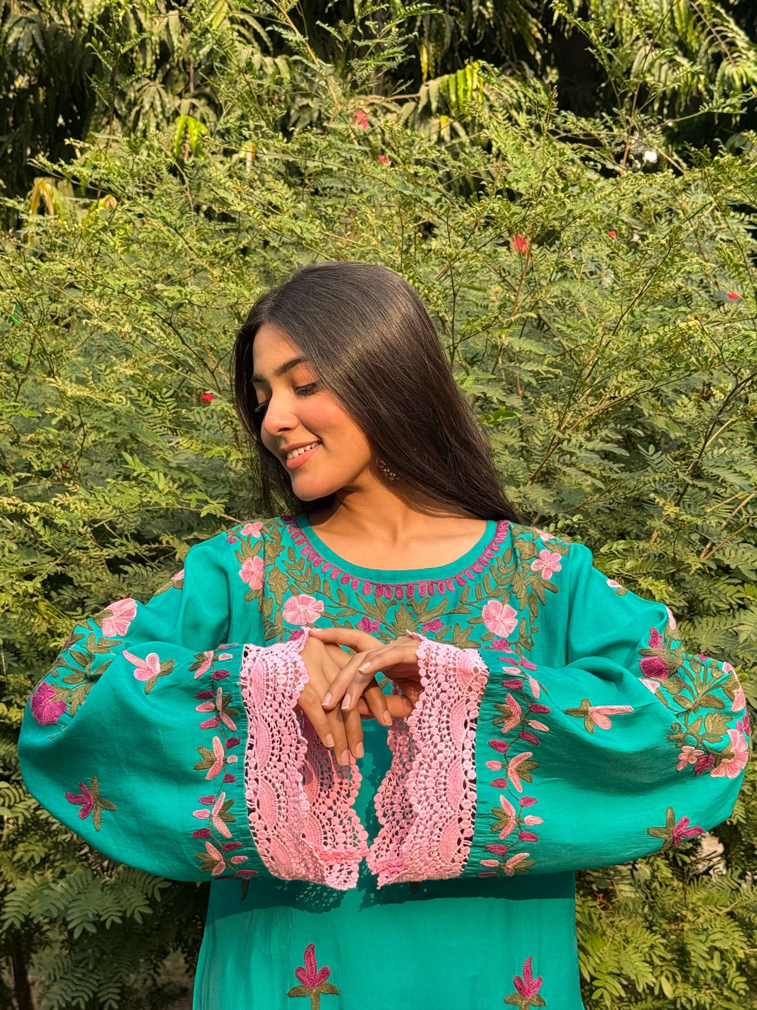 Asmeet in Falak Kashmiri Long Kurta In Turquoise Blue Muslin With Aari