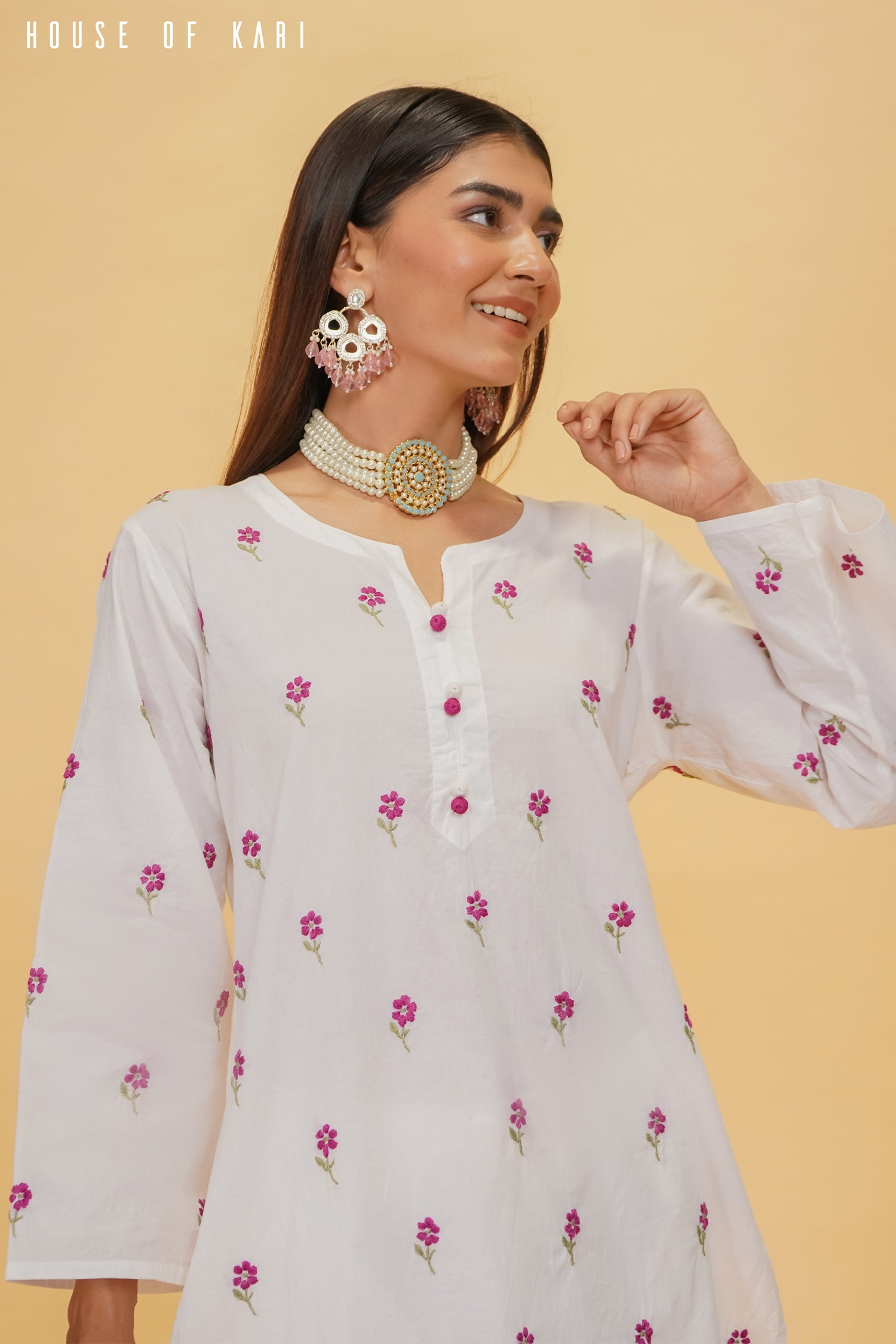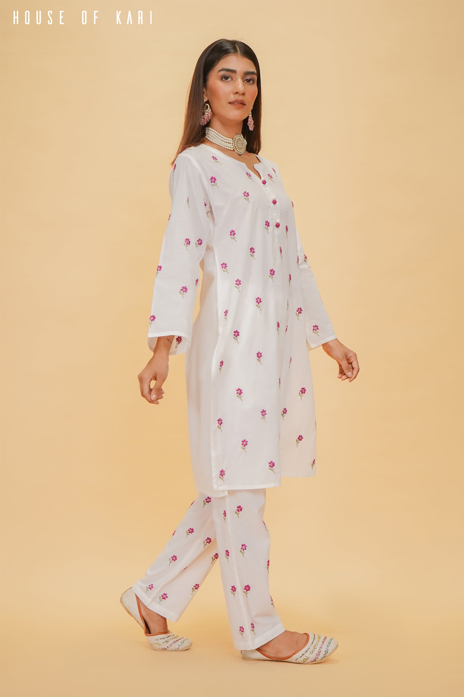 Step into effortless elegance with this House of Kari Chikankari kurta set, crafted in breathable white cotton fabric with a flattering 38-inch length. This set exudes grace and sophistication, featuring delicate floral hand embroidery scattered across the kurta and matching straight-fit pants. Each tiny embroidered bloom is intricately handcrafted, adding a subtle yet charming detail to the ensemble.