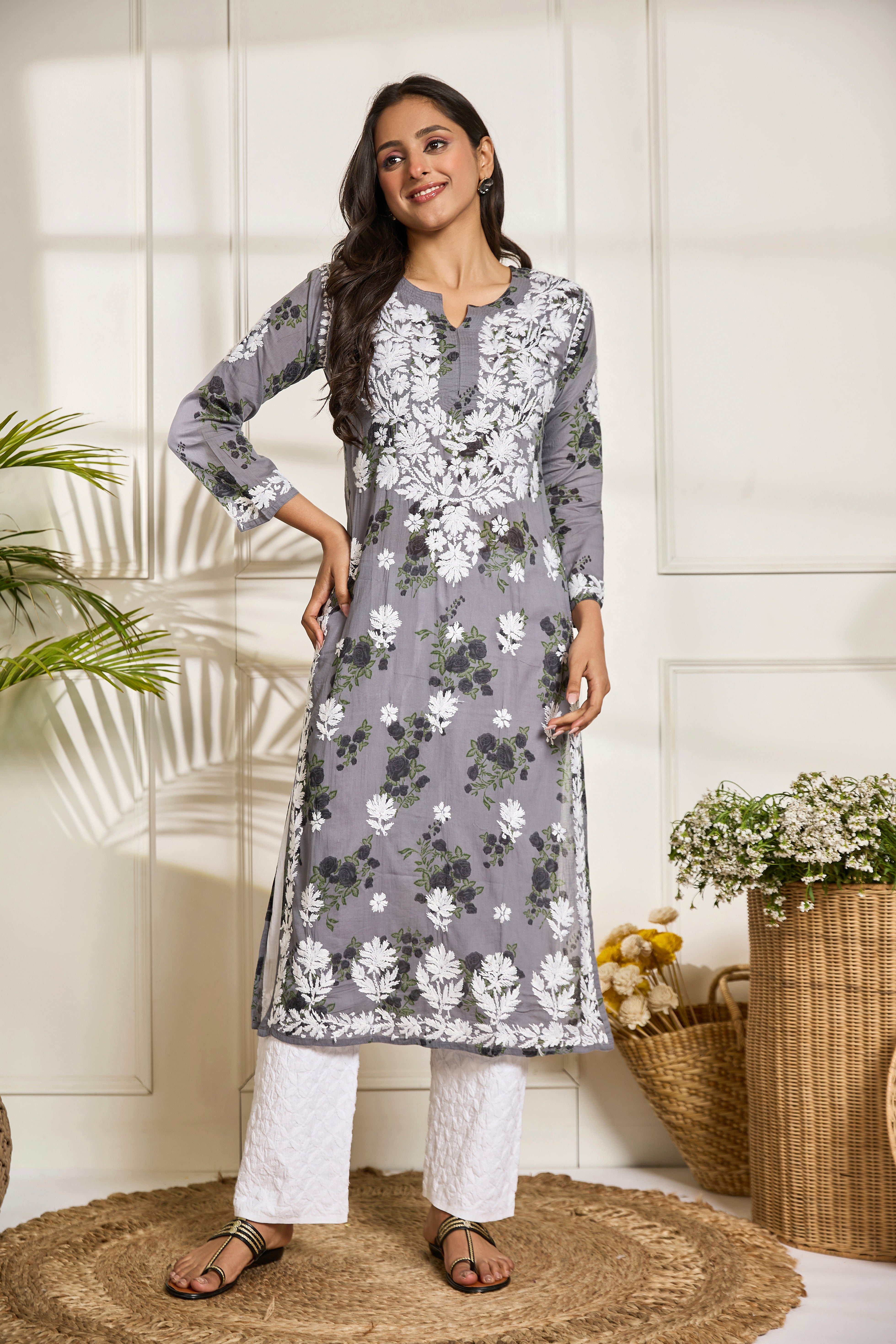 Saba Chikankari Kurta in Mul cotton in Grey print
