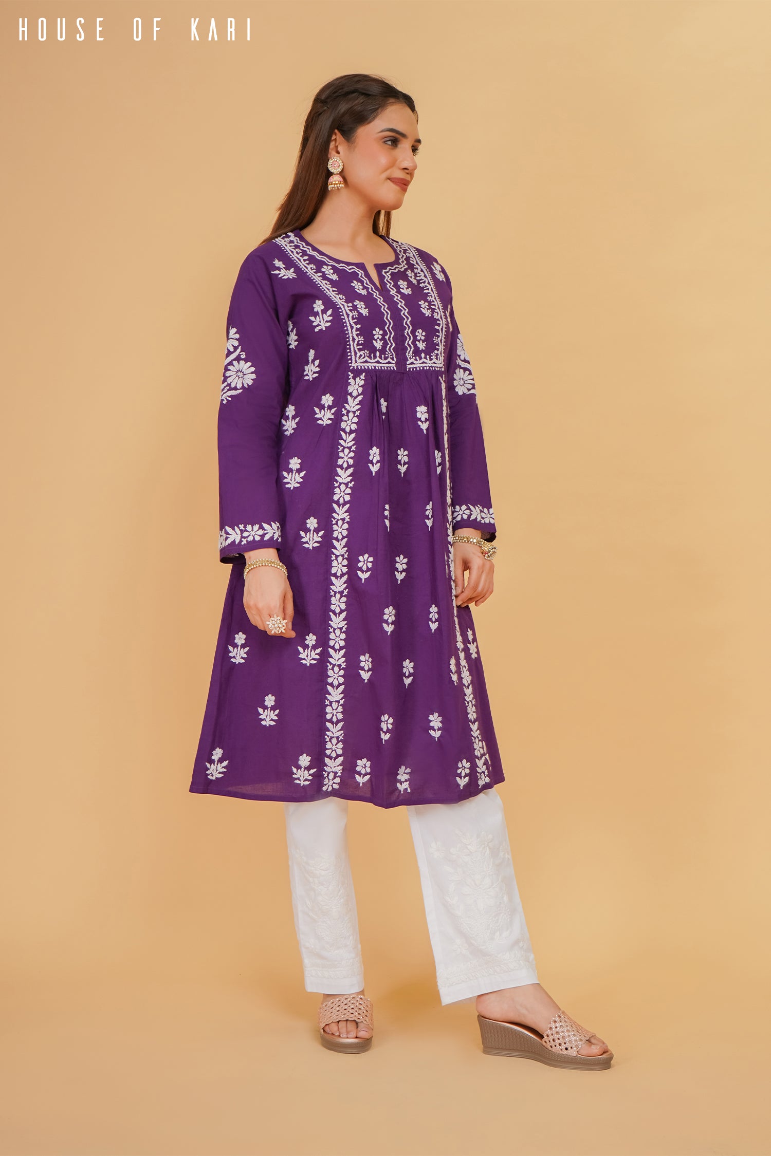The hand-embroidered Chikankari work in contrasting white thread beautifully adorns the yoke, sleeves, and flare, creating a timeless and graceful look. The soft gathers add a touch of femininity, making it a must-have for effortless ethnic styling.