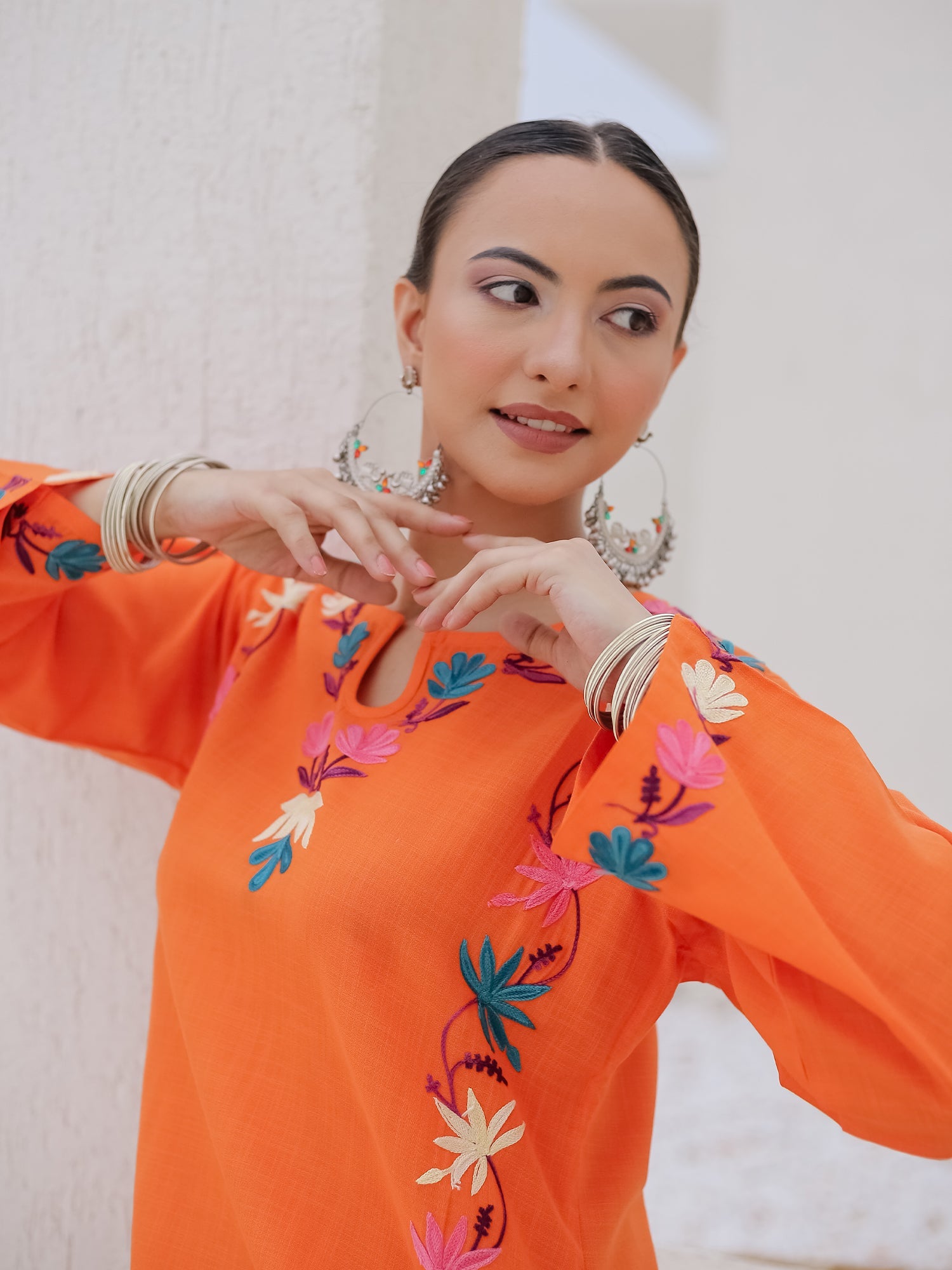 The 36-Inch Long Kurta Features Exquisite Kashmiri Aari Work, Blending Traditional Craftsmanship With Modern Design. Its Notch Neck Style Adds A Touch Of Sophistication, Suitable For Both Casual And Formal Wear. Crafted With Precision, The Orange Kurta Exudes Purity And Sophistication, Complemented By The Celestial Inspiration Of "Falak." This Intricate Embroidery And Decorative Patterns Are Reminiscent Of Kashmir'S Rich Cultural Heritage, Showcasing The Region'S Skilled Artisans. Pair With Vibrant Palazzos For A Chic Contrast Or Leggings For A Classic Look. Elevate Any Occasion With This Timeless Piece, Effortlessly Combining Tradition And Modernity.