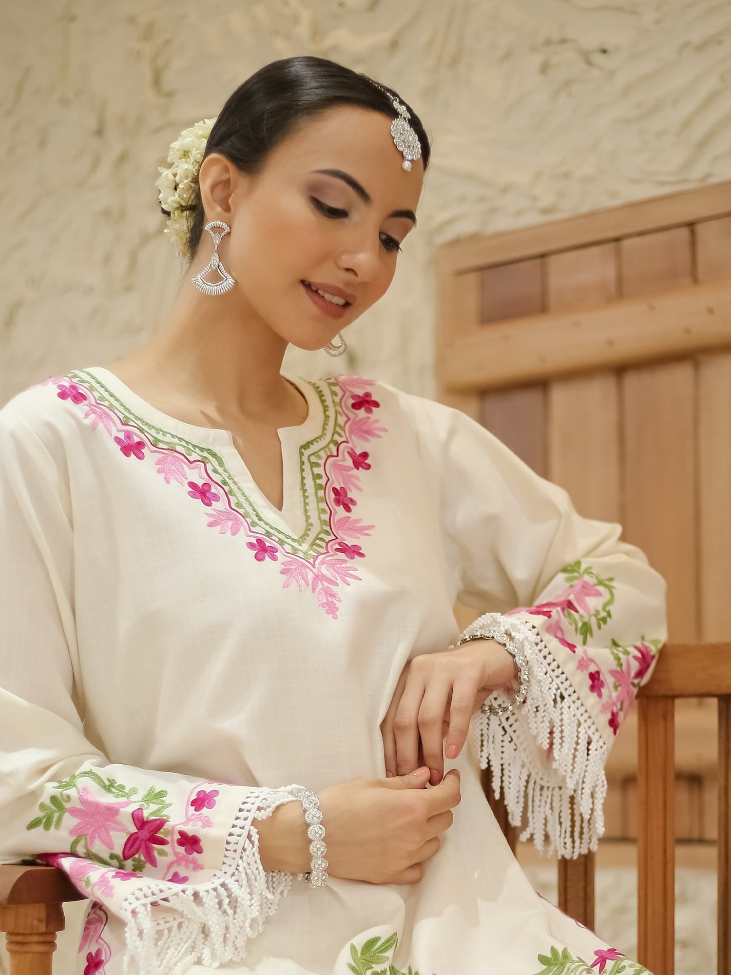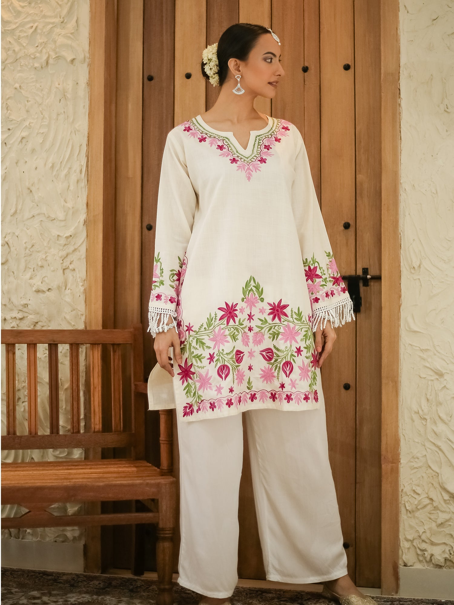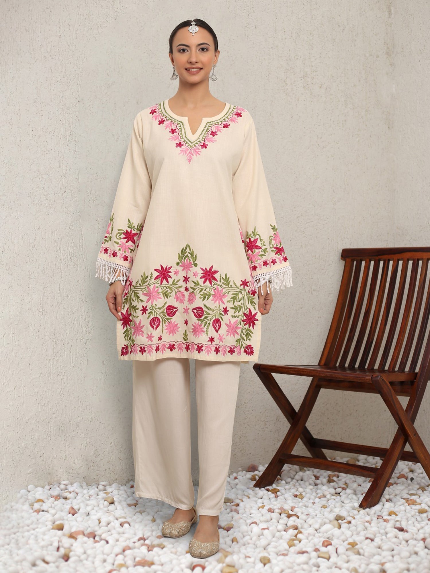 The 36-Inch Long Kurta Features Exquisite Kashmiri Aari Work, Blending Traditional Craftsmanship With Modern Design. Its Round Neckline Adds Versatility, Suitable For Both Casual And Formal Wear. Crafted With Precision, The White Kurta Exudes Purity And Sophistication, Complemented By The Celestial Inspiration Of "Falak." This Intricate Embroidery And Decorative Patterns Are Reminiscent Of Kashmir'S Rich Cultural Heritage, Showcasing The Region'S Skilled Artisans. Pair With Vibrant Palazzos For A Chic Contrast Or Leggings For A Classic Look. Elevate Any Occasion With This Timeless Piece, Effortlessly Combining Tradition And Modernity.