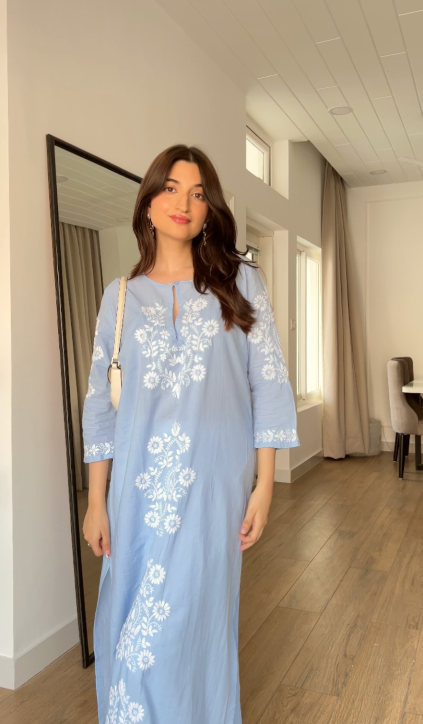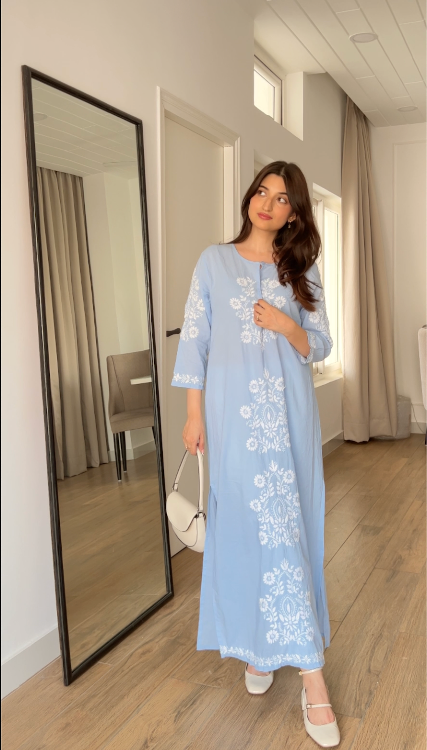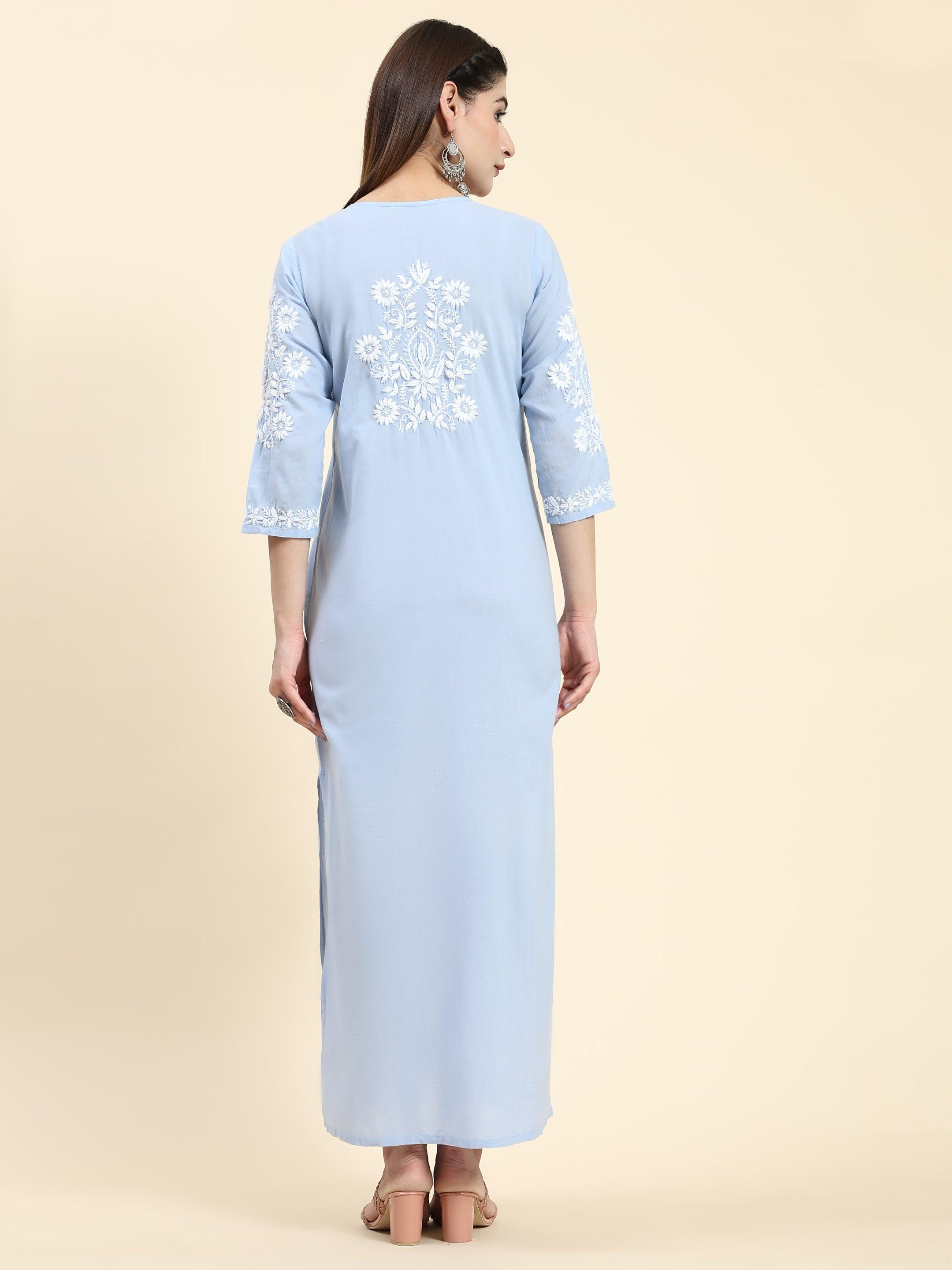 Farheen in Chikankari Long Kurti In Cotton for Women- Blue with White