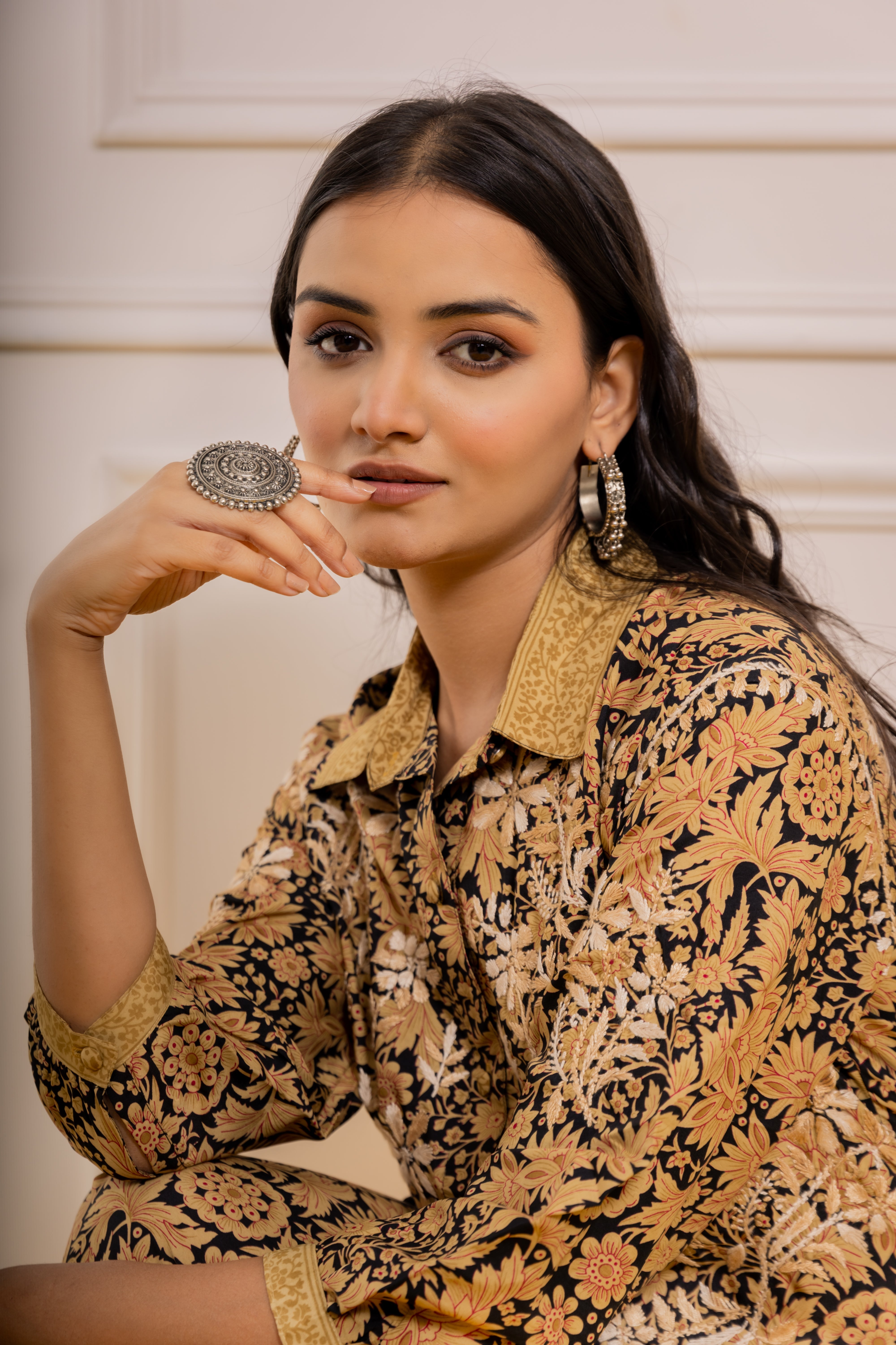 FIzaa Black and Golden Silk Print Set with Beige Hand Embroidery