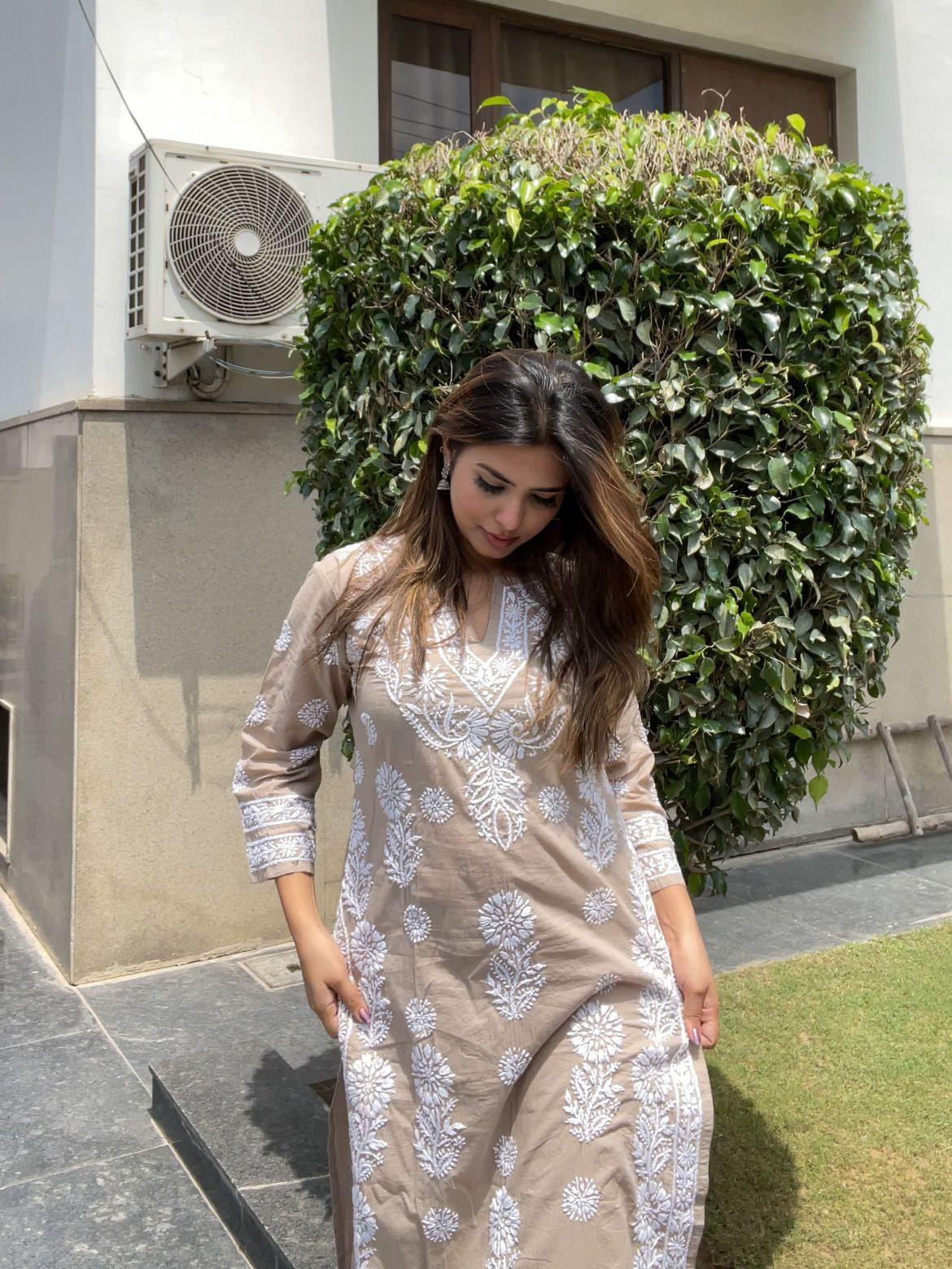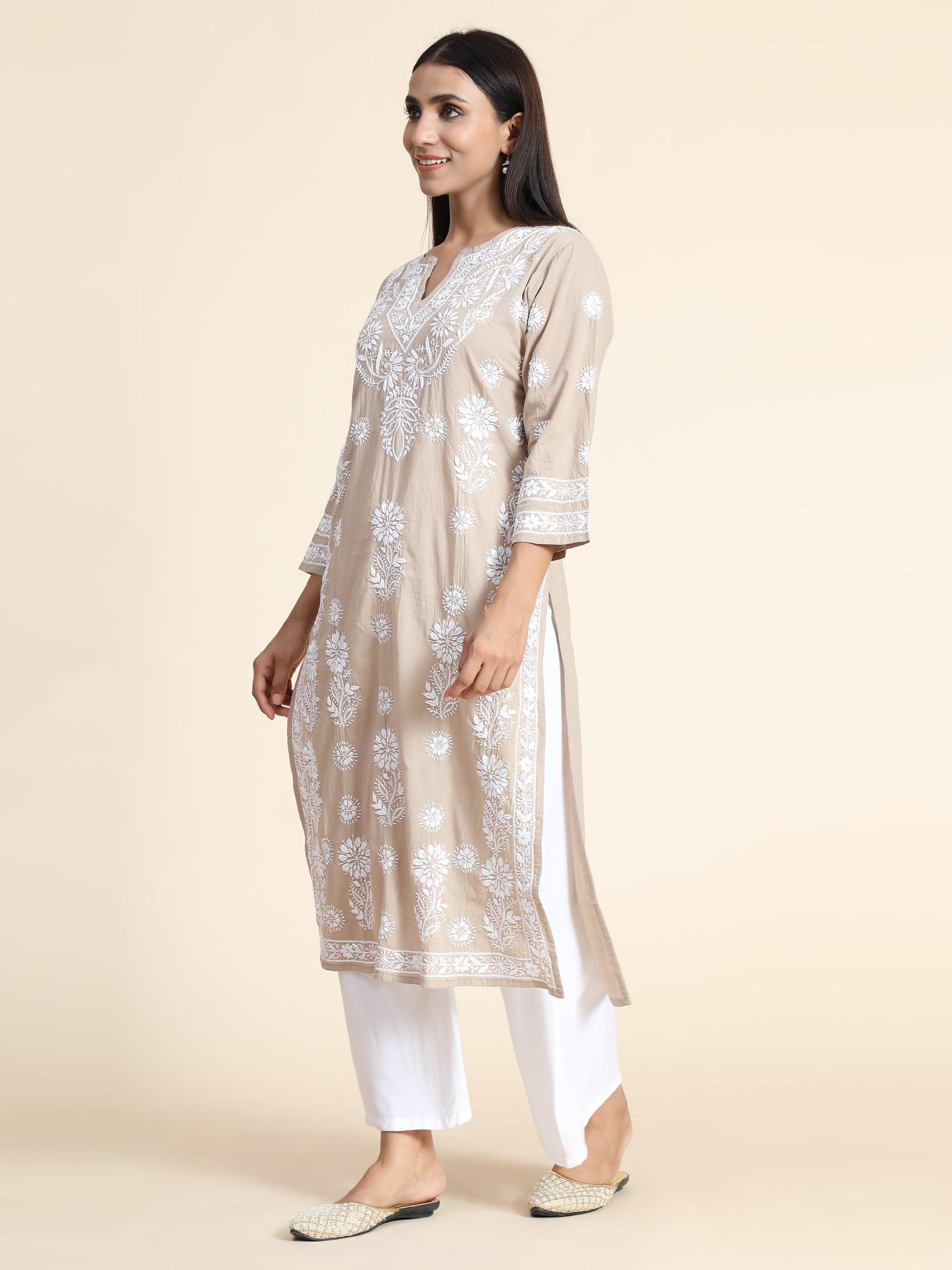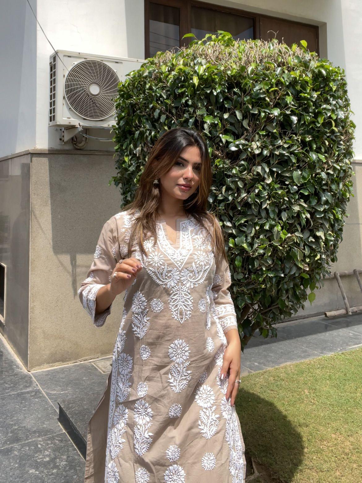 Aanchal in HOK Chikankari Long Kurti for Women Beige & White-2