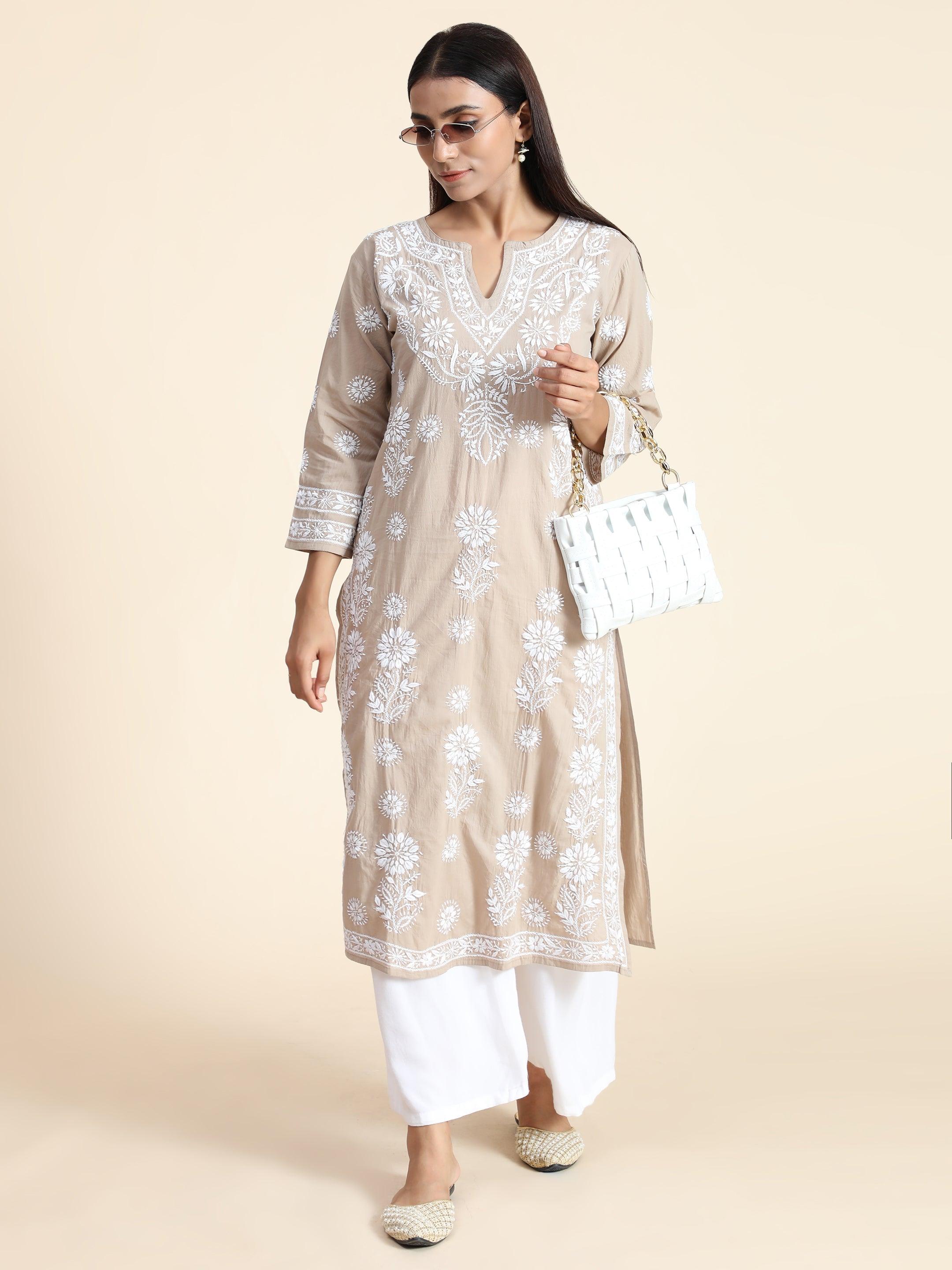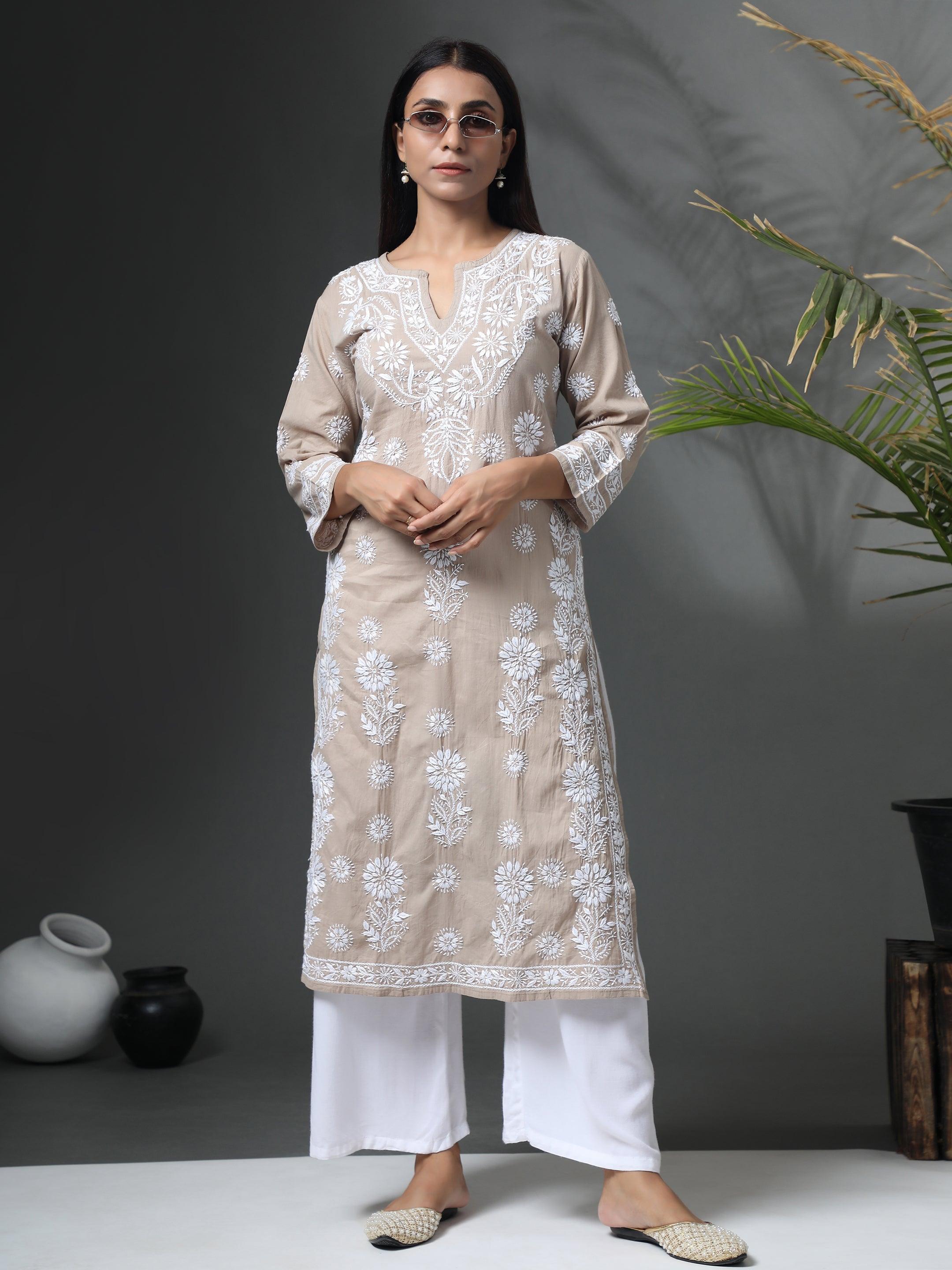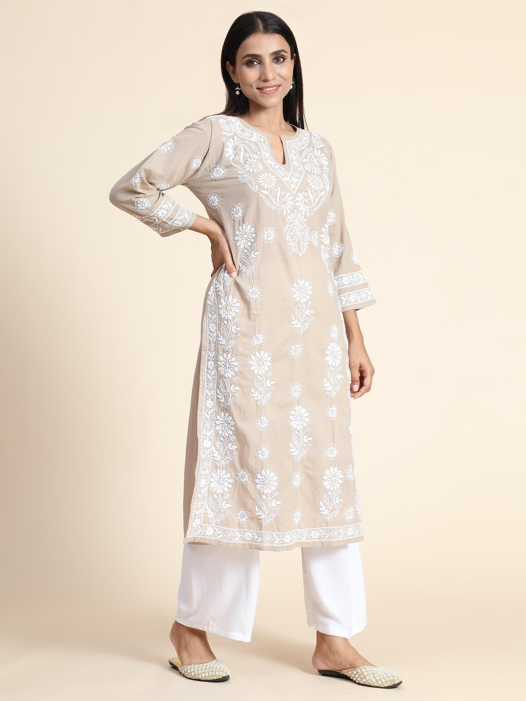 Aanchal in HOK Chikankari Long Kurti for Women Beige & White-2