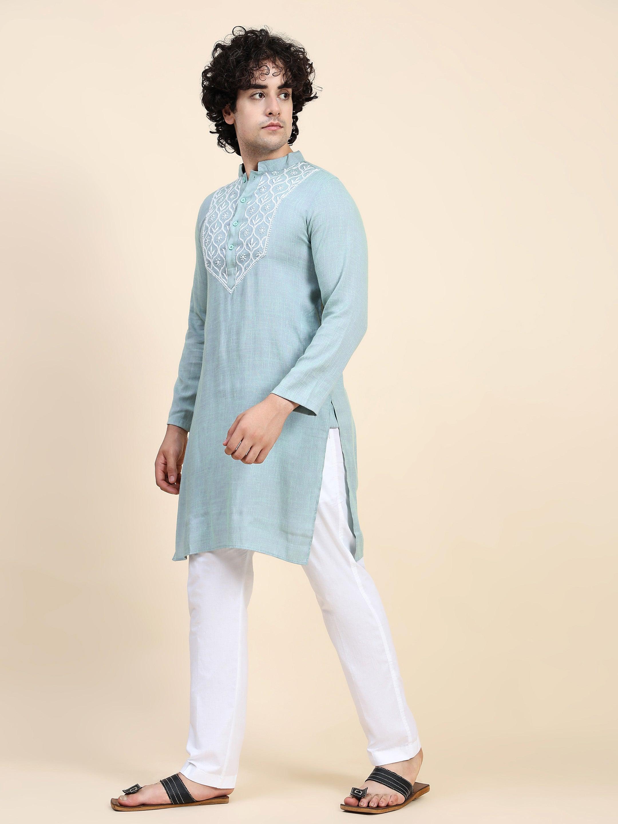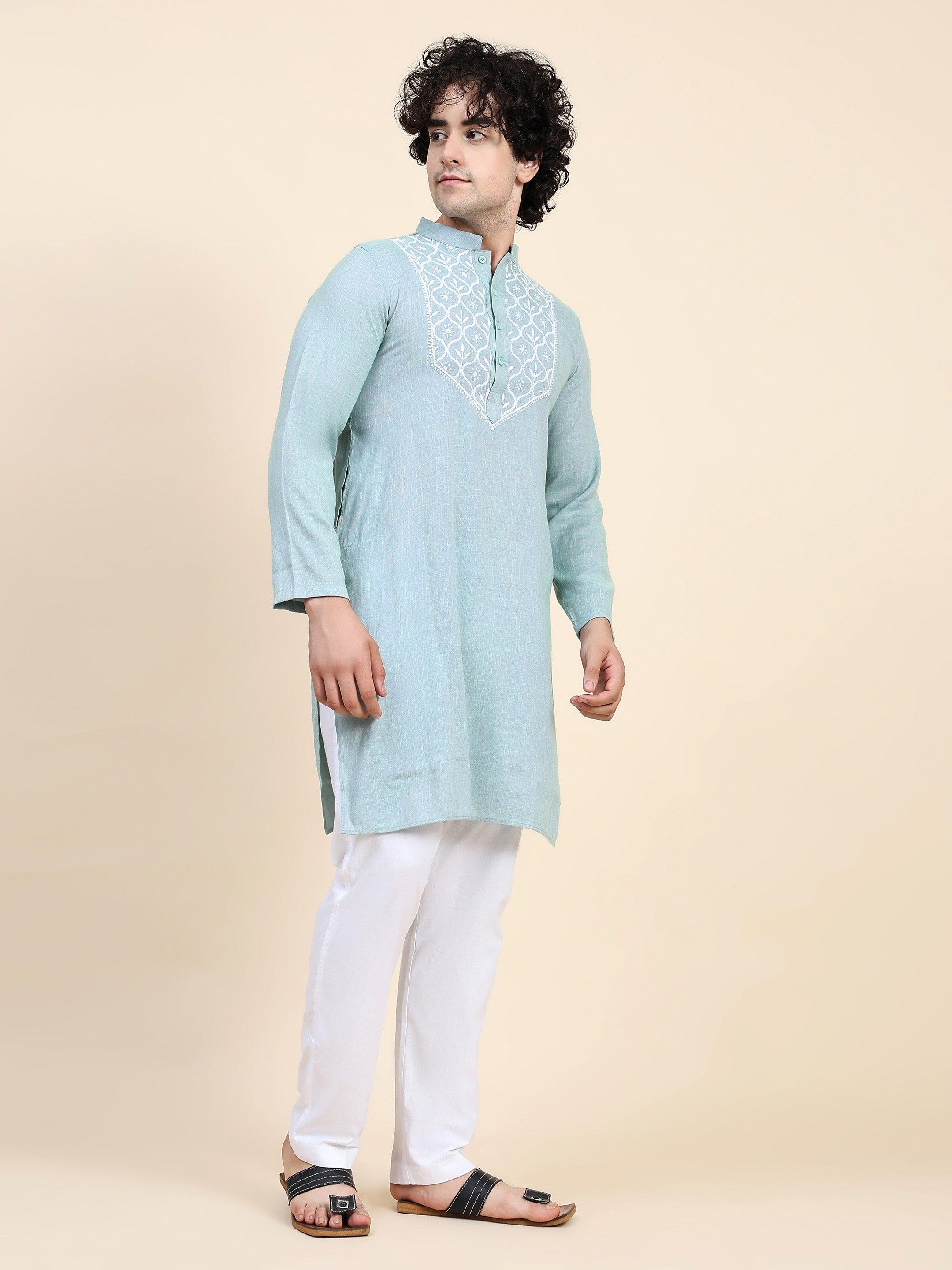 HOK Men's Chikankari Kurta in Cotton Silk Blend - Sea Green