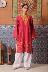 Bold, vibrant, and winter-perfect – this Maroon Kashmiri Woolen Phiran from House of Kari’s Winter Collection is all about heritage with a modern edge. Crafted in soft woolen fabric, it features a flattering V-neckline beautifully highlighted with Kashmiri Aari embroidery in pink, orange, and beige florals. The embroidery continues along the hemline with elegant floral vines and subtle sleeve detailing, adding layers of artisanal charm. At 40 inches in length, this Phiran is versatile enough for festive celebrations, family gatherings, or a cozy evening out. A warm hug of Kashmiri craft, designed to keep you stylish and snug.