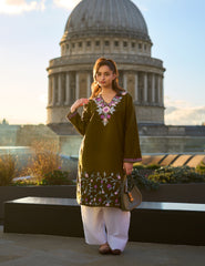 Add a pop of sunshine to your winter days with this Deep Red Kashmiri Woolen Phiran from House of Kari’s Winter Collection. Crafted in soft woolen fabric, it features a chic V-neckline that comes alive with bright Kashmiri Aari embroidery in marigold yellow and tangerine floral motifs. The embroidery extends to the hemline with delicate vine work and subtle sleeve borders, making it a perfect mix of tradition and cheer. With its 40-inch length, this Phiran wraps you in cozy warmth while keeping your style vibrant – ideal for festive get-togethers, casual outings, or those winter evenings when you want to stand out.