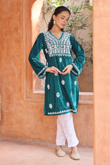 When winter calls for elegance, this velvet chikankari kurta answers in style! Crafted in luxurious teal blue velvet, this 38-inch kurta is adorned with stunning hand-embroidered chikankari that celebrates the age-old craft of Lucknow. The delicate white embroidery pops beautifully against the rich base, making it a true show-stopper.