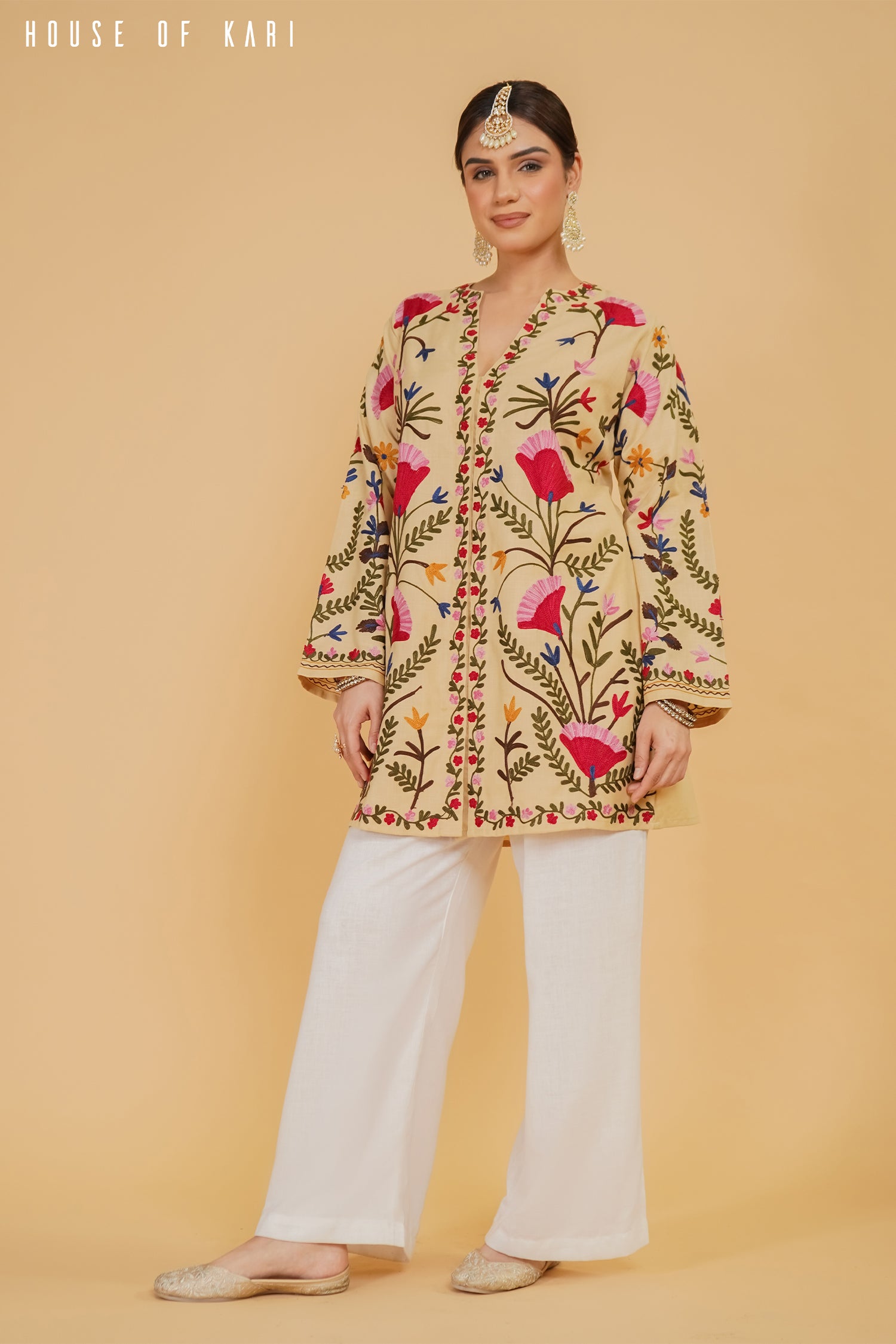 Style this Beige Kashmiri Aari Work Jacket with palazzos, straight pants, or denim for a refined and graceful ensemble! 🤍