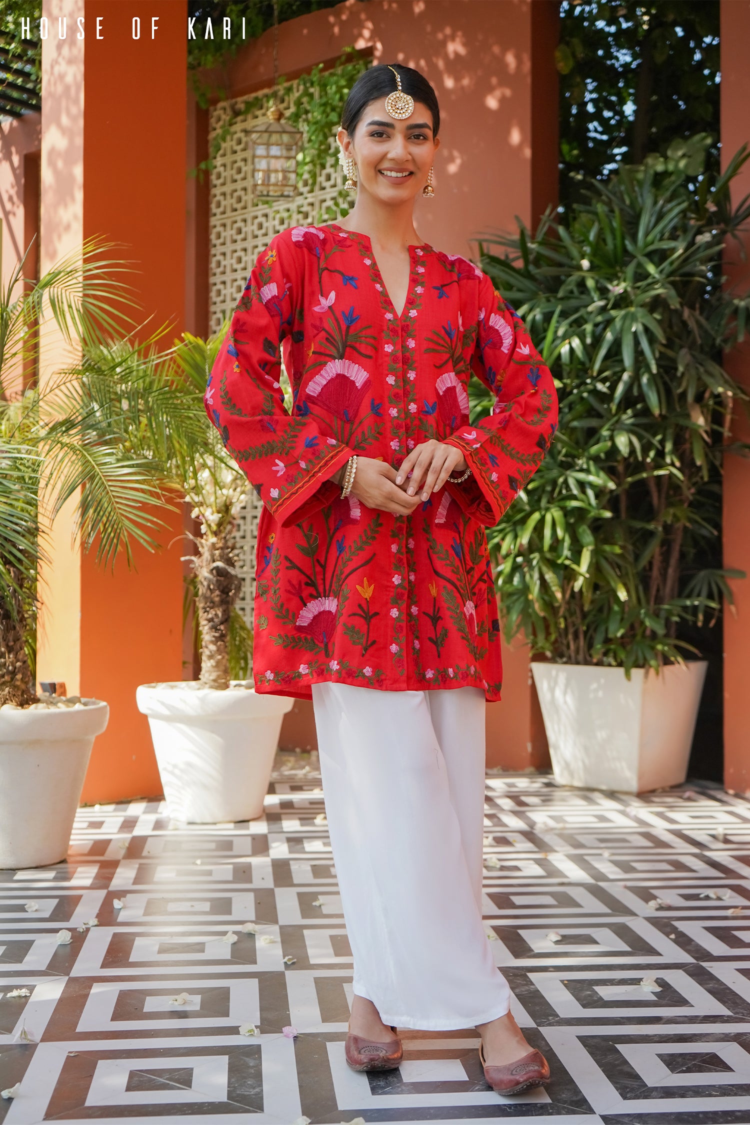 - ✔ Rich Red Color with intricate Kashmiri Aari embroidery
