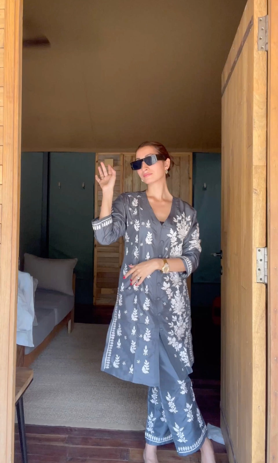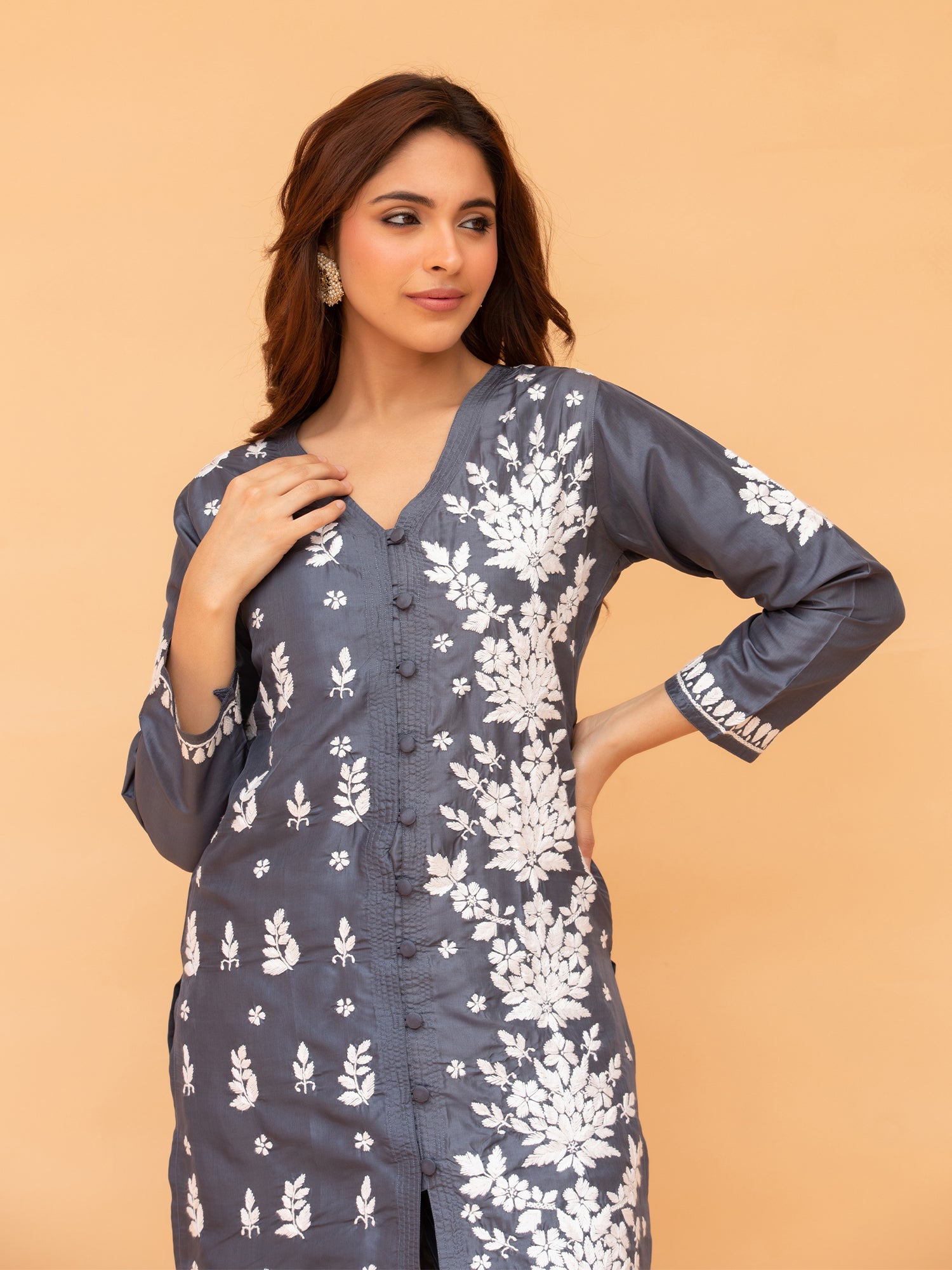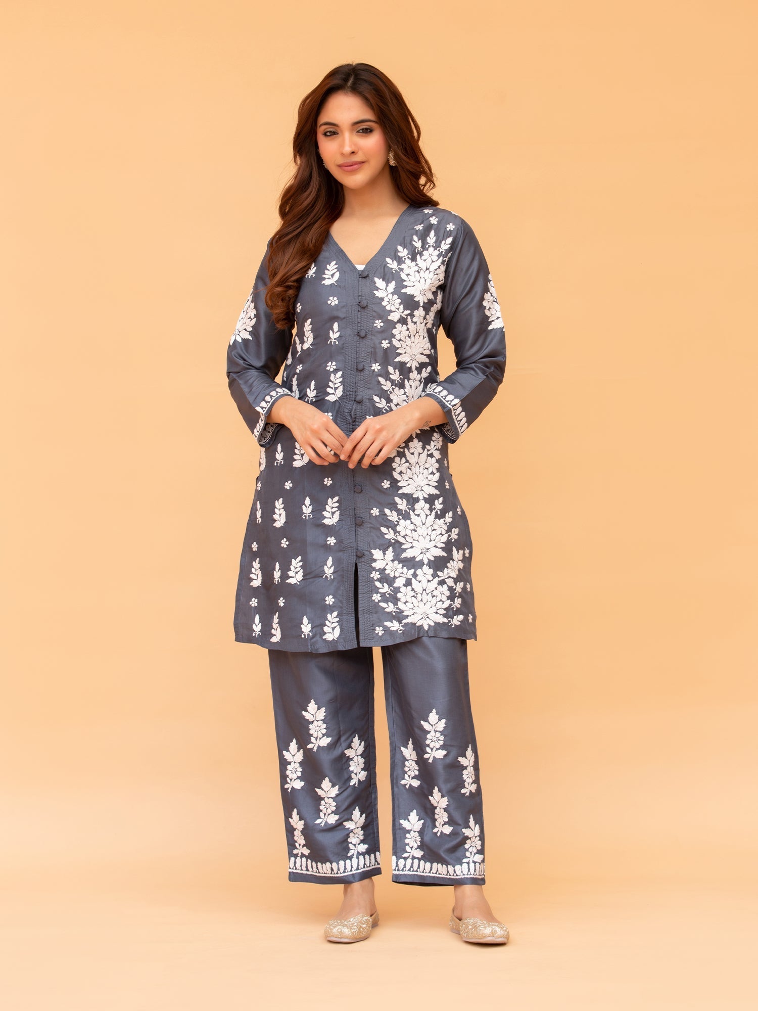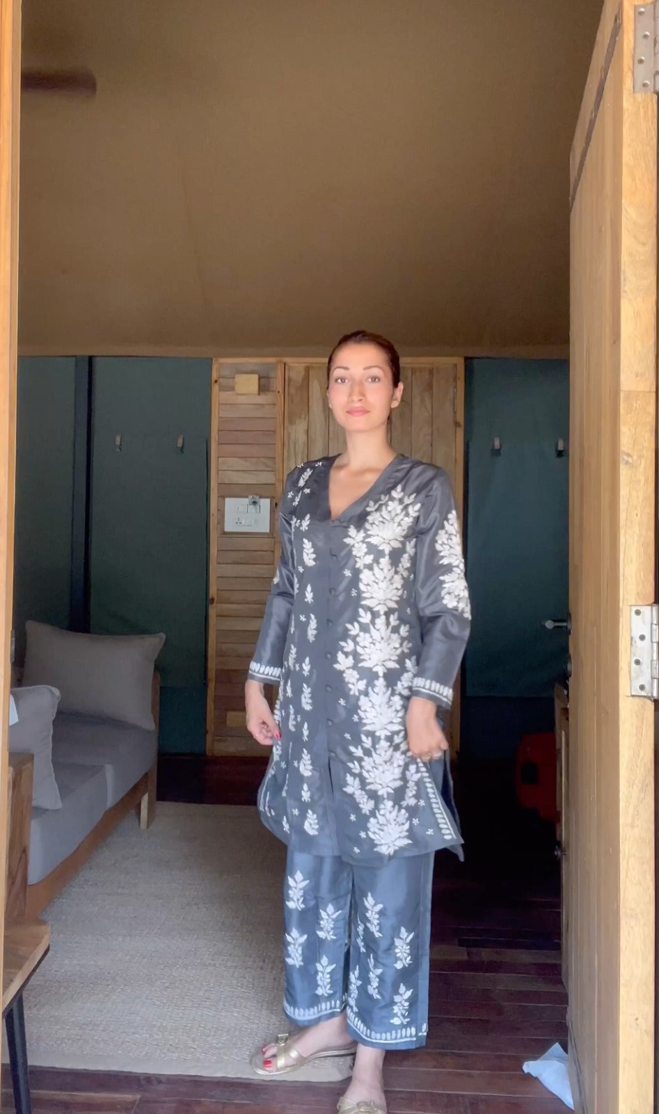 Mohi in Saba Chikankari Kurta Set in Habutai Silk - Grey