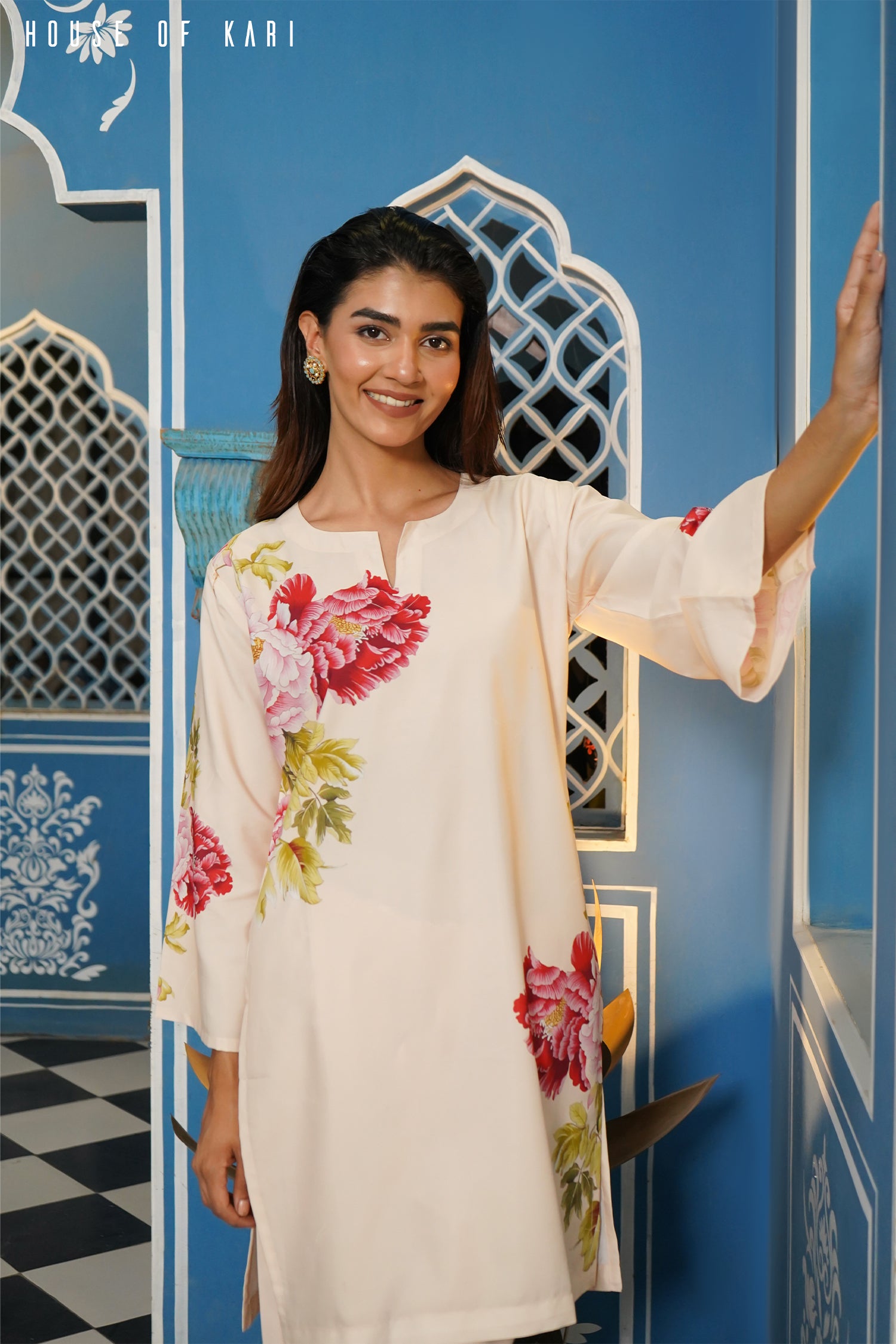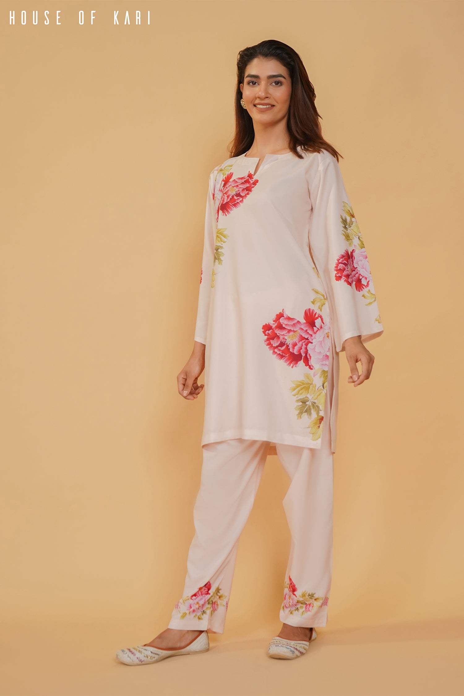 Top: A soft blush pink base adorned with vibrant floral prints in shades of red, pink, and green, adding a fresh and feminine touch.