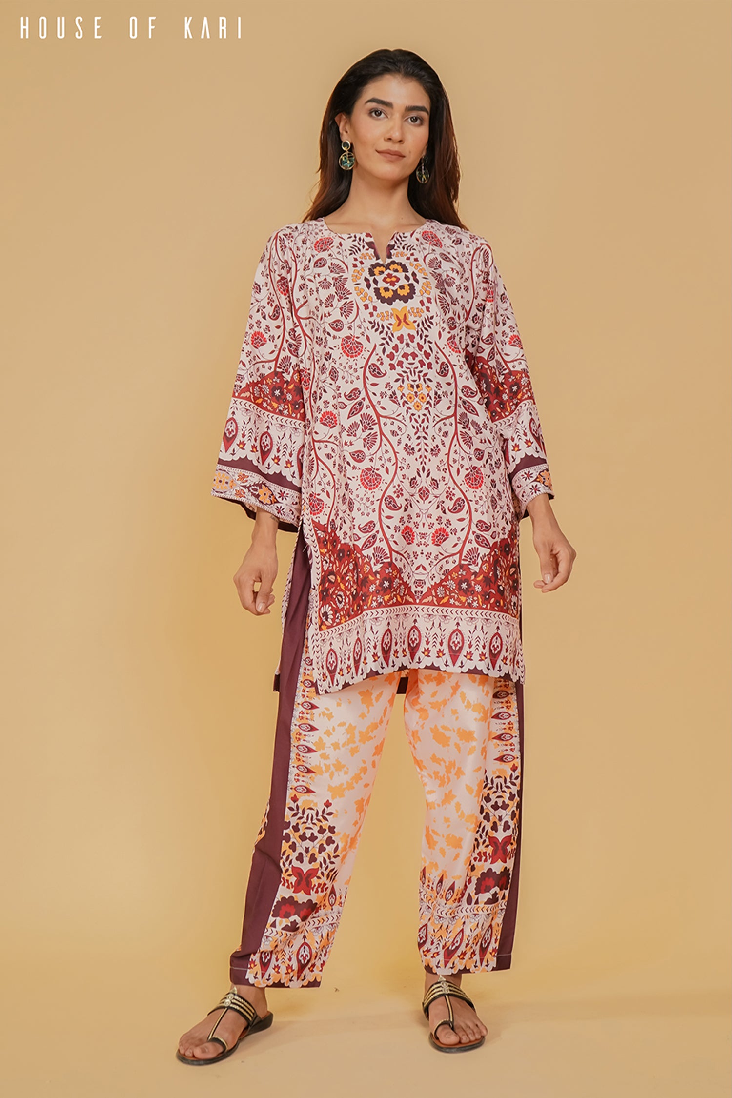 Step into effortless elegance with this Beige & Maroon Printed Co-ord Set from House of Kari’s Summer Collection. Crafted from lightweight poly muslin, this breezy ensemble ensures all-day comfort while exuding timeless charm.