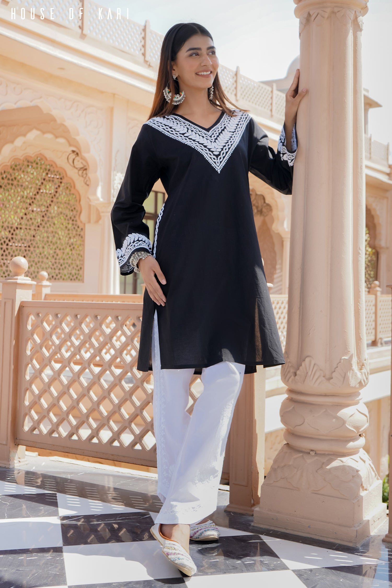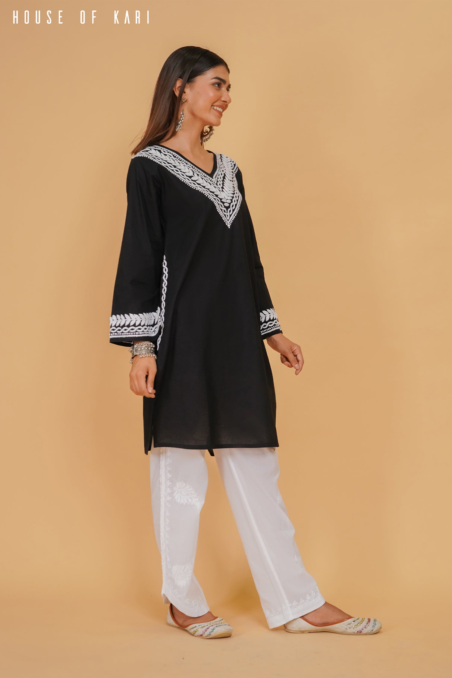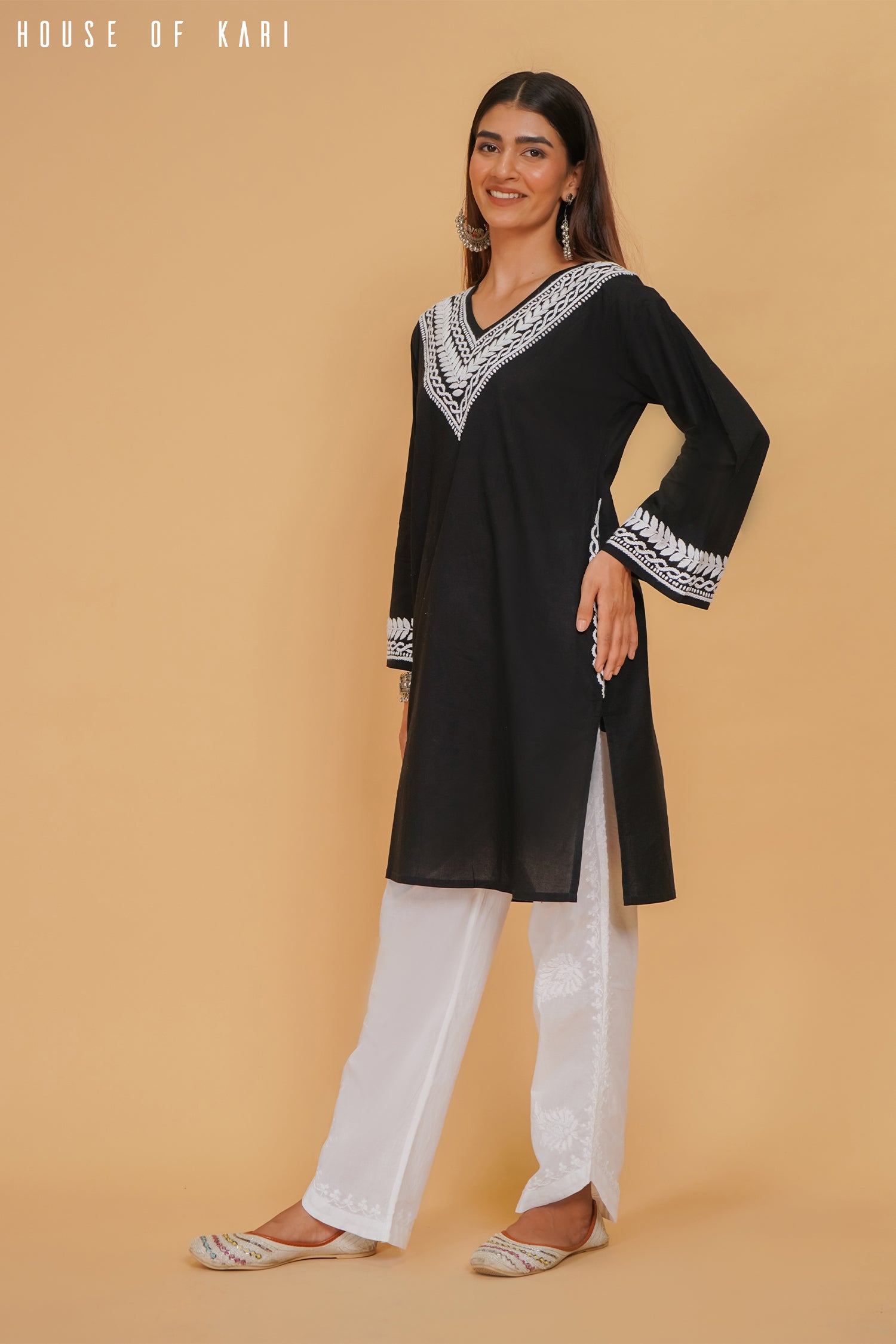 The V-neckline is adorned with intricate hand-embroidered Chikankari work, exuding an aura of refined craftsmanship. The full sleeves are delicately detailed with matching embroidery, adding a touch of charm to its minimalistic yet striking silhouette.