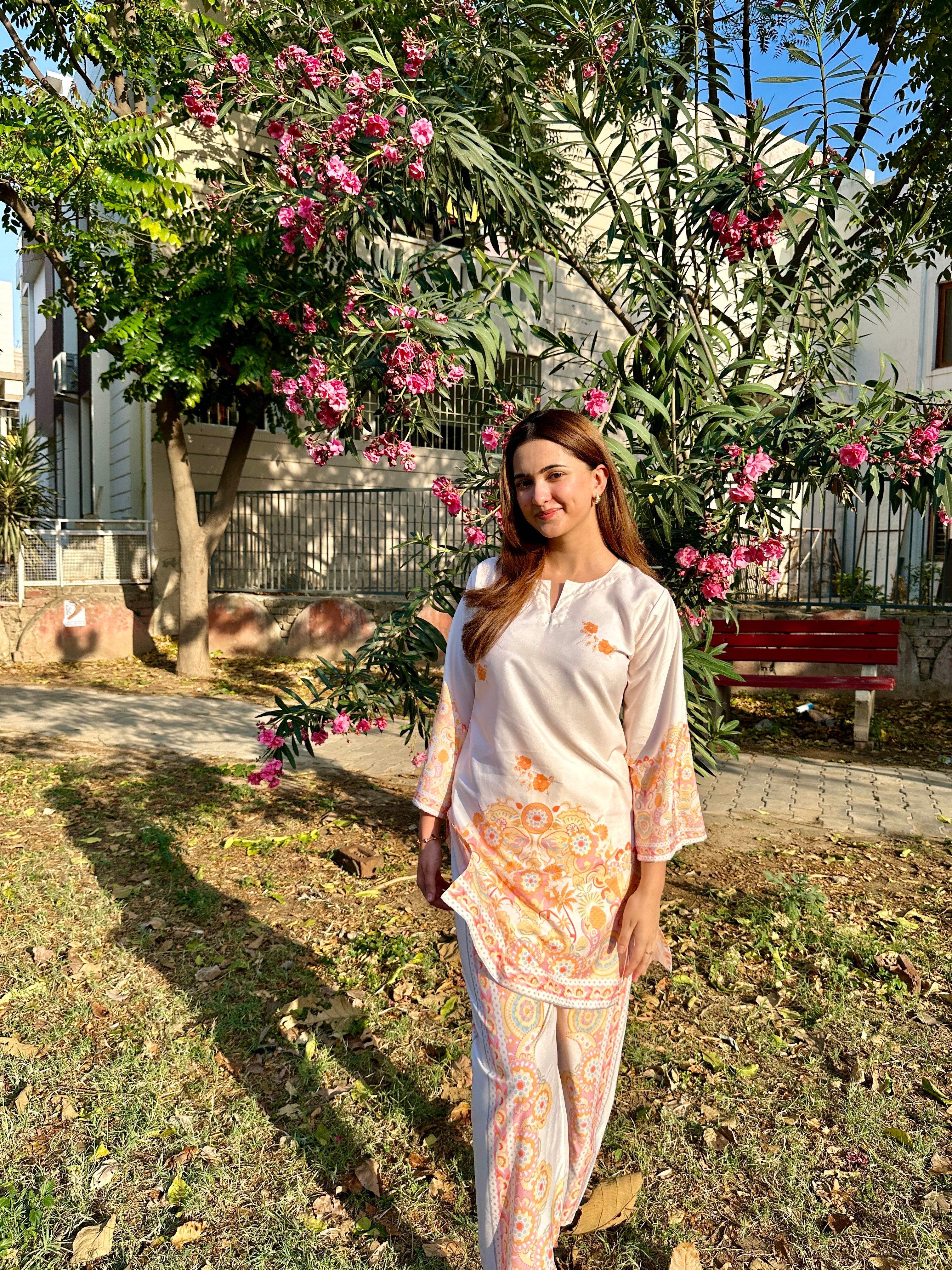 Top: A delicate pastel peach base adorned with intricate orange floral and paisley prints, enhanced with ornamental detailing on the hem and sleeves.