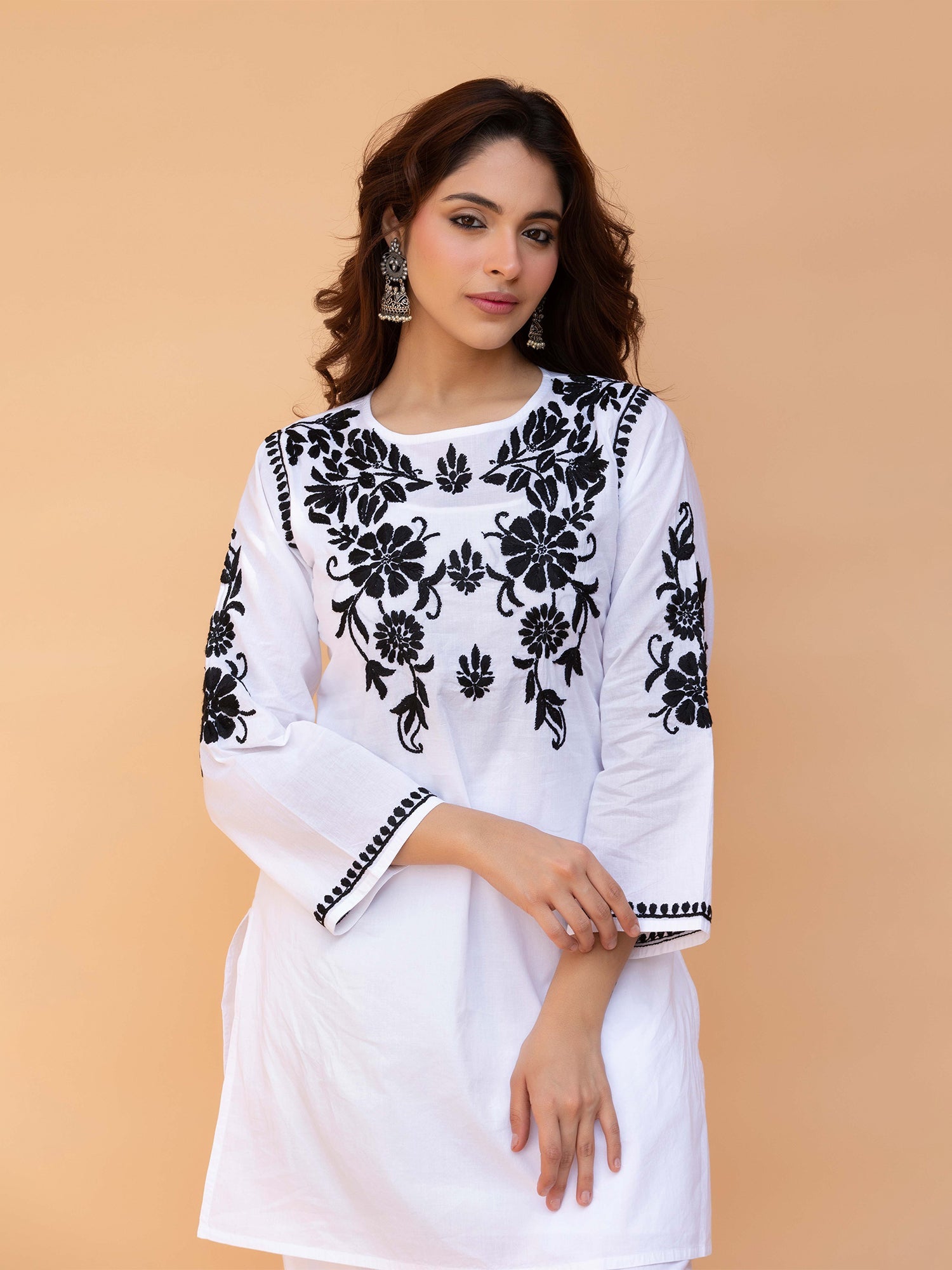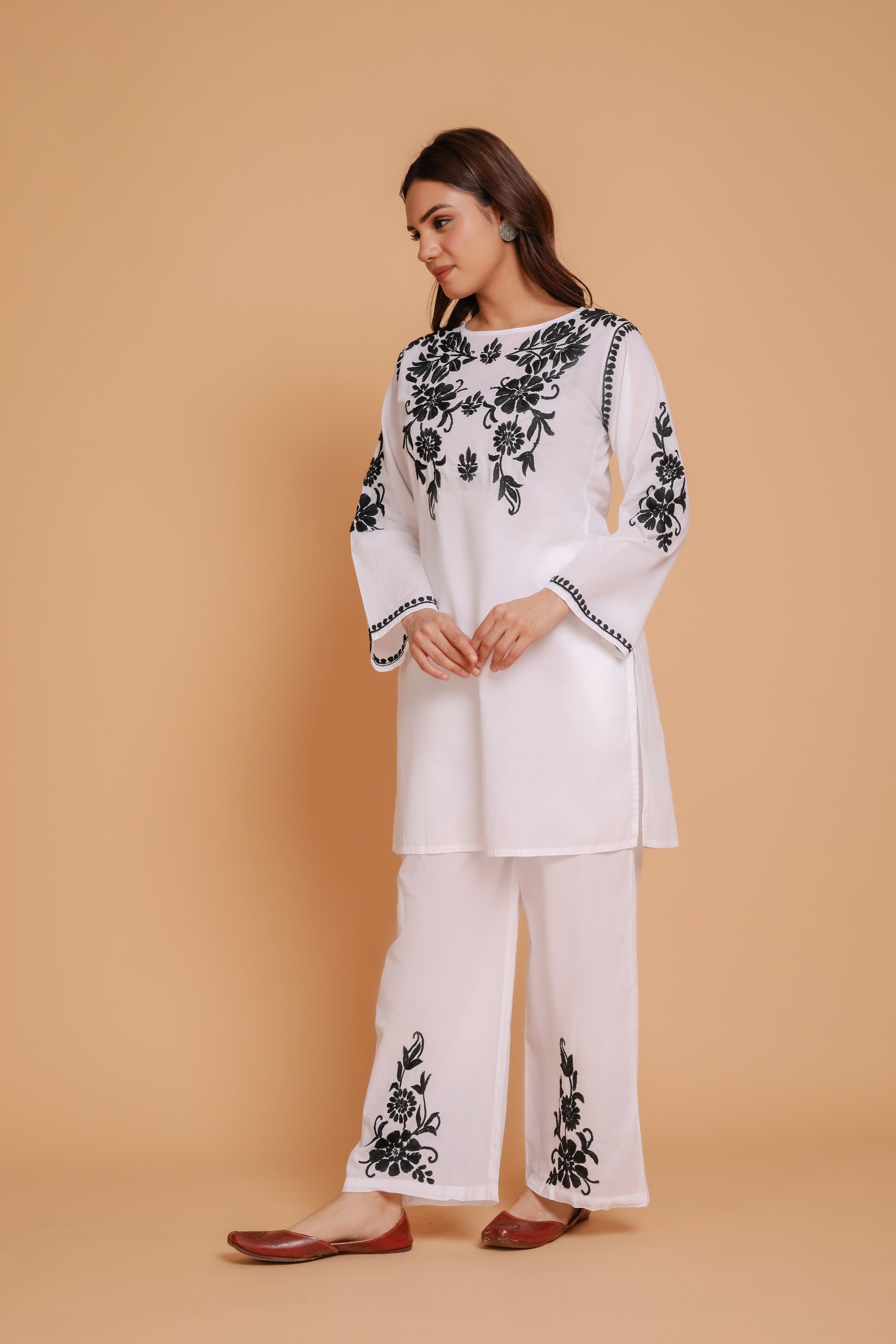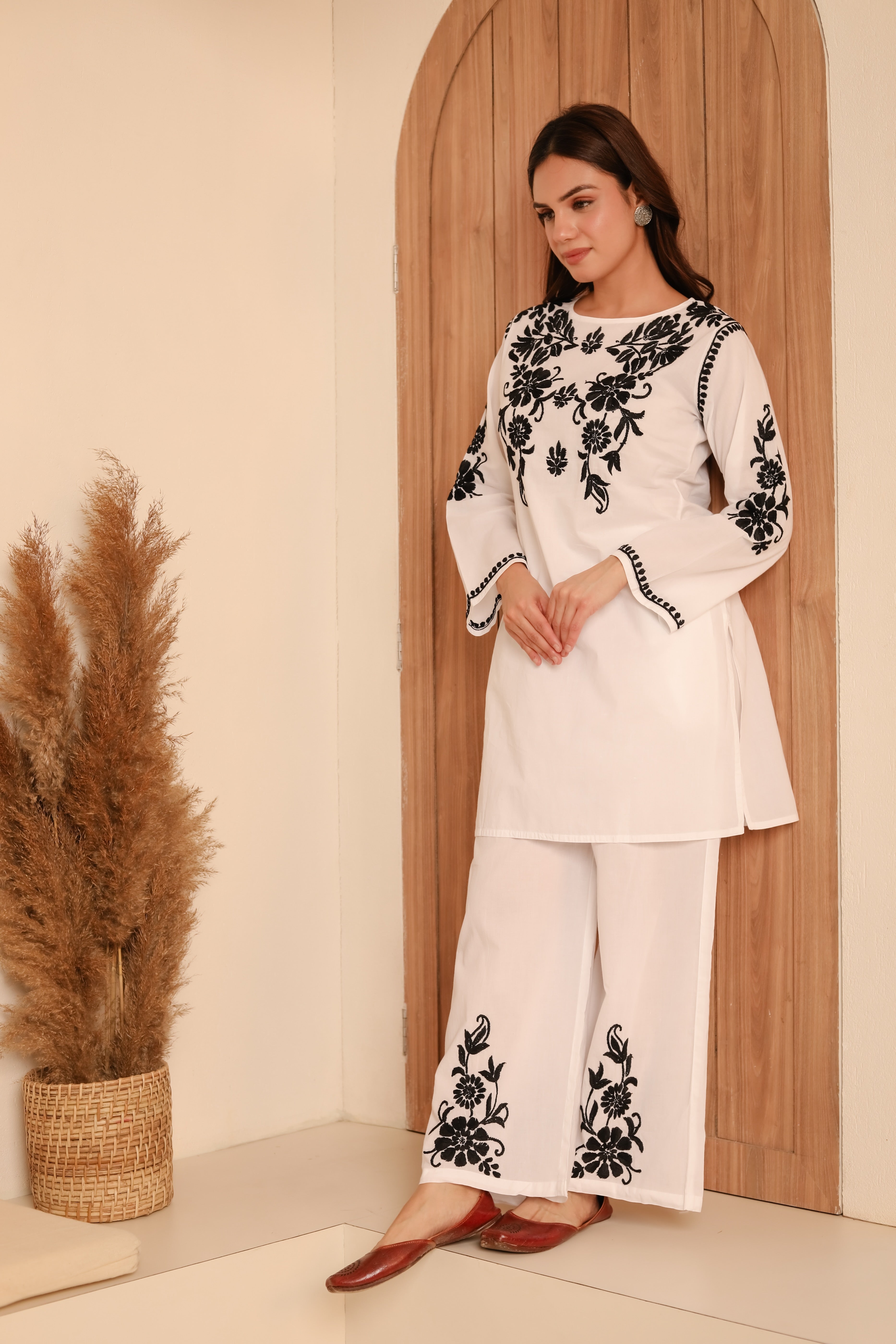 Saba Chikankari Co-ord Set in Cotton Cambric - White With Black