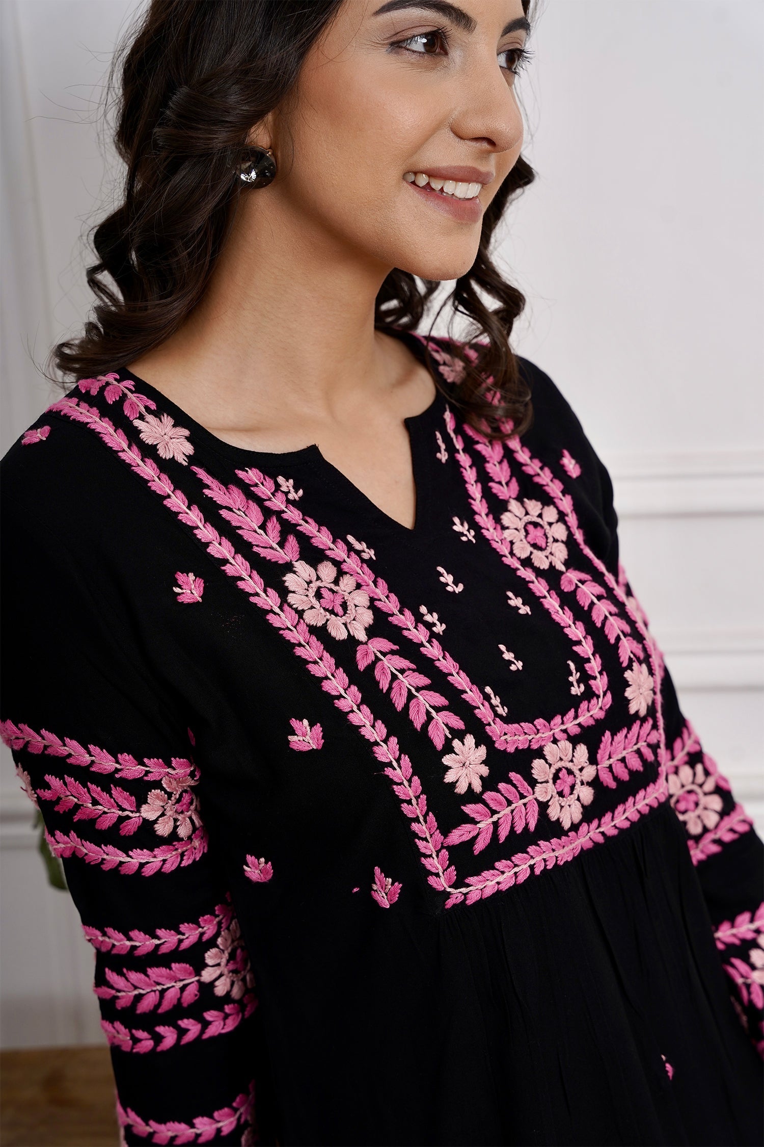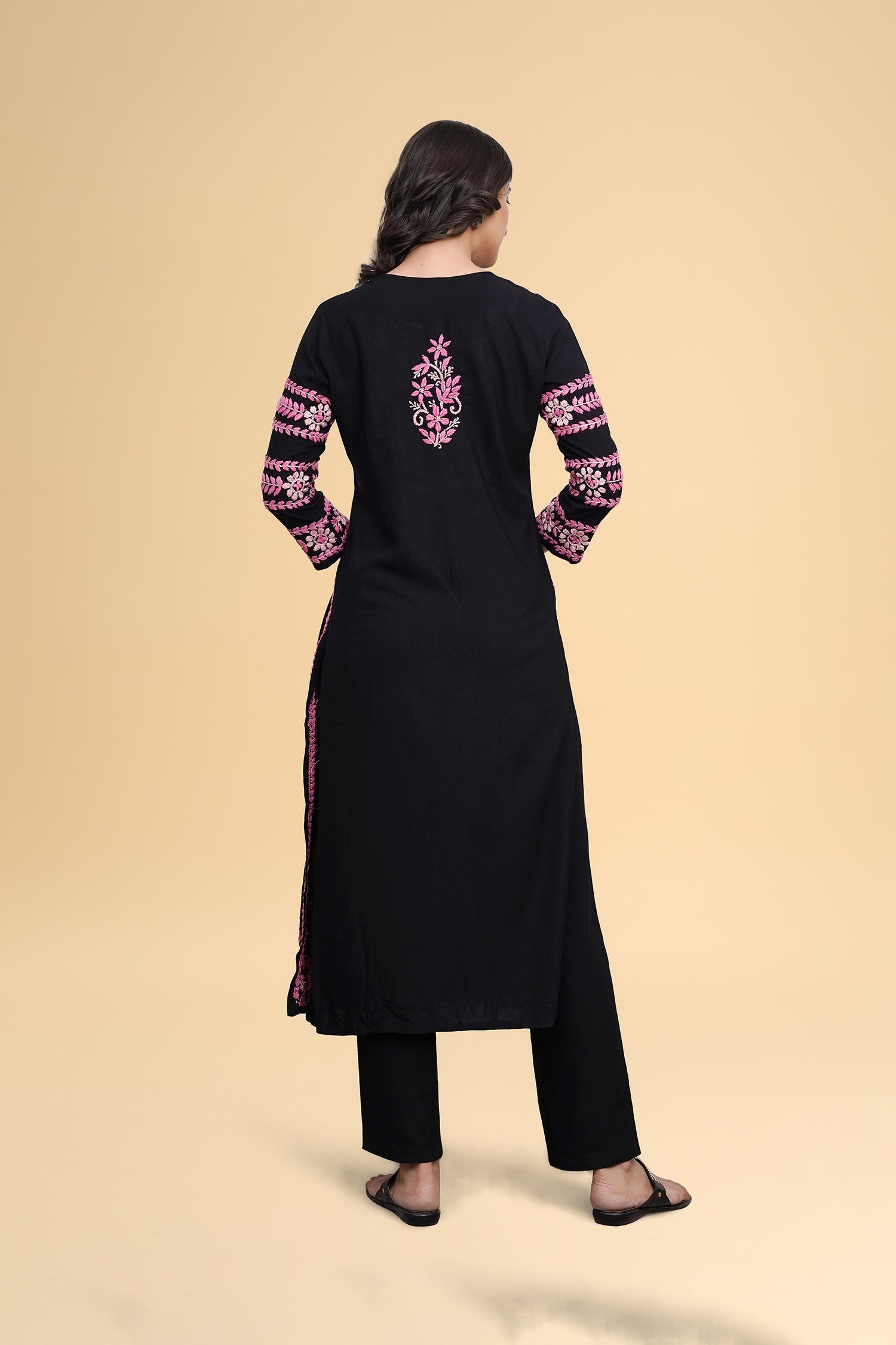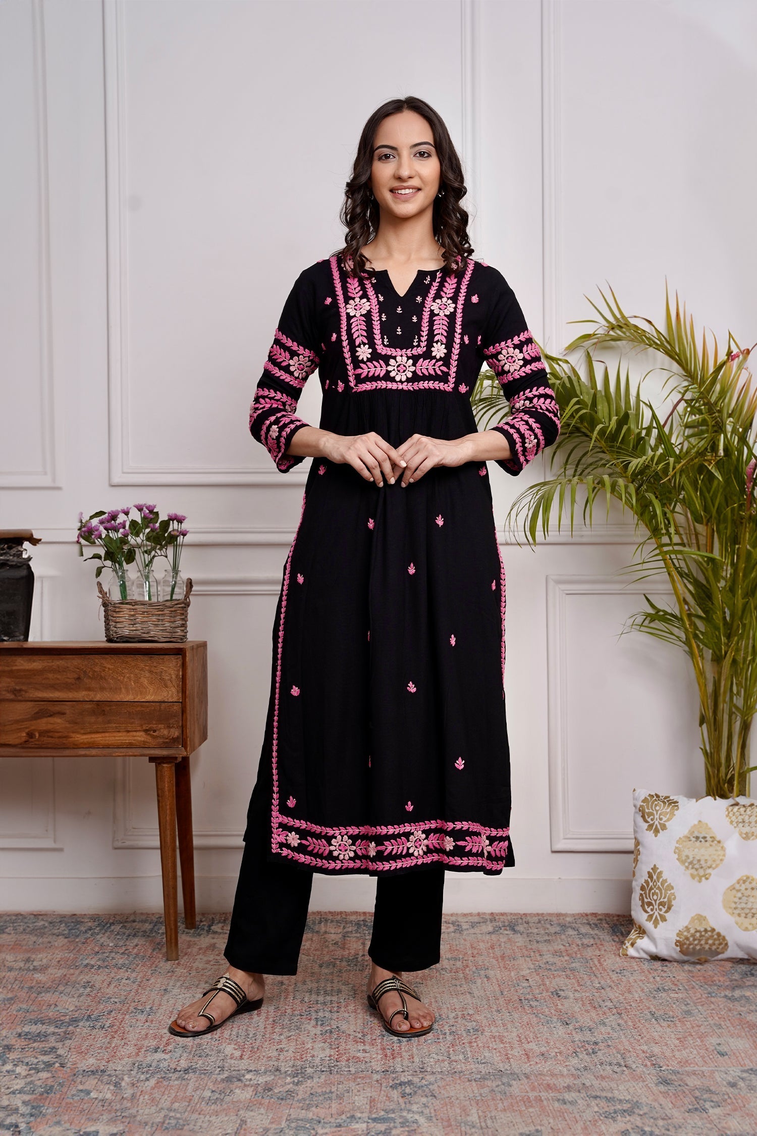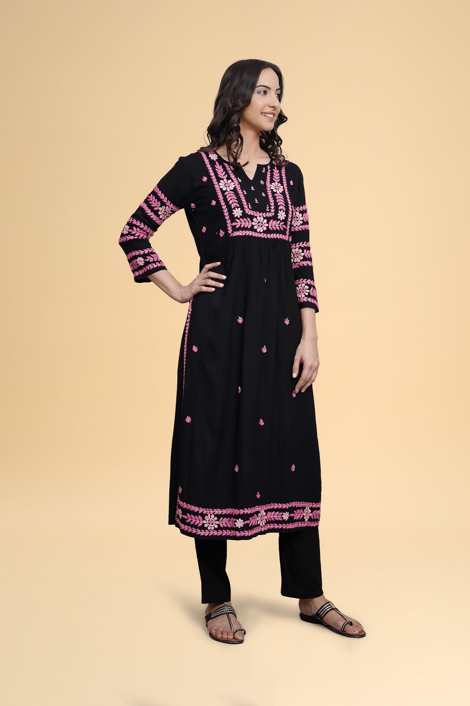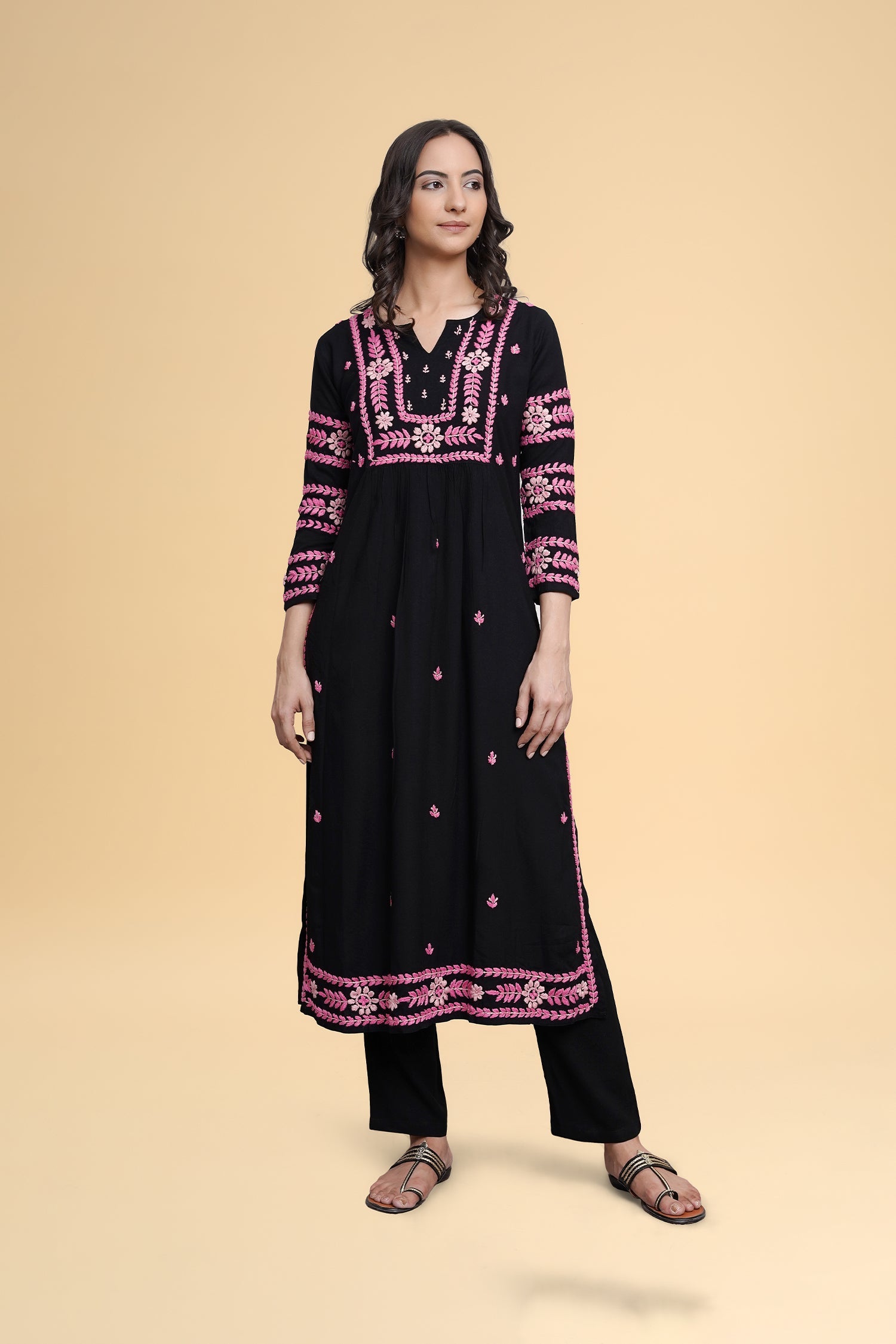 Saba Chikankari Long Kurta in Rayon Cotton - Black