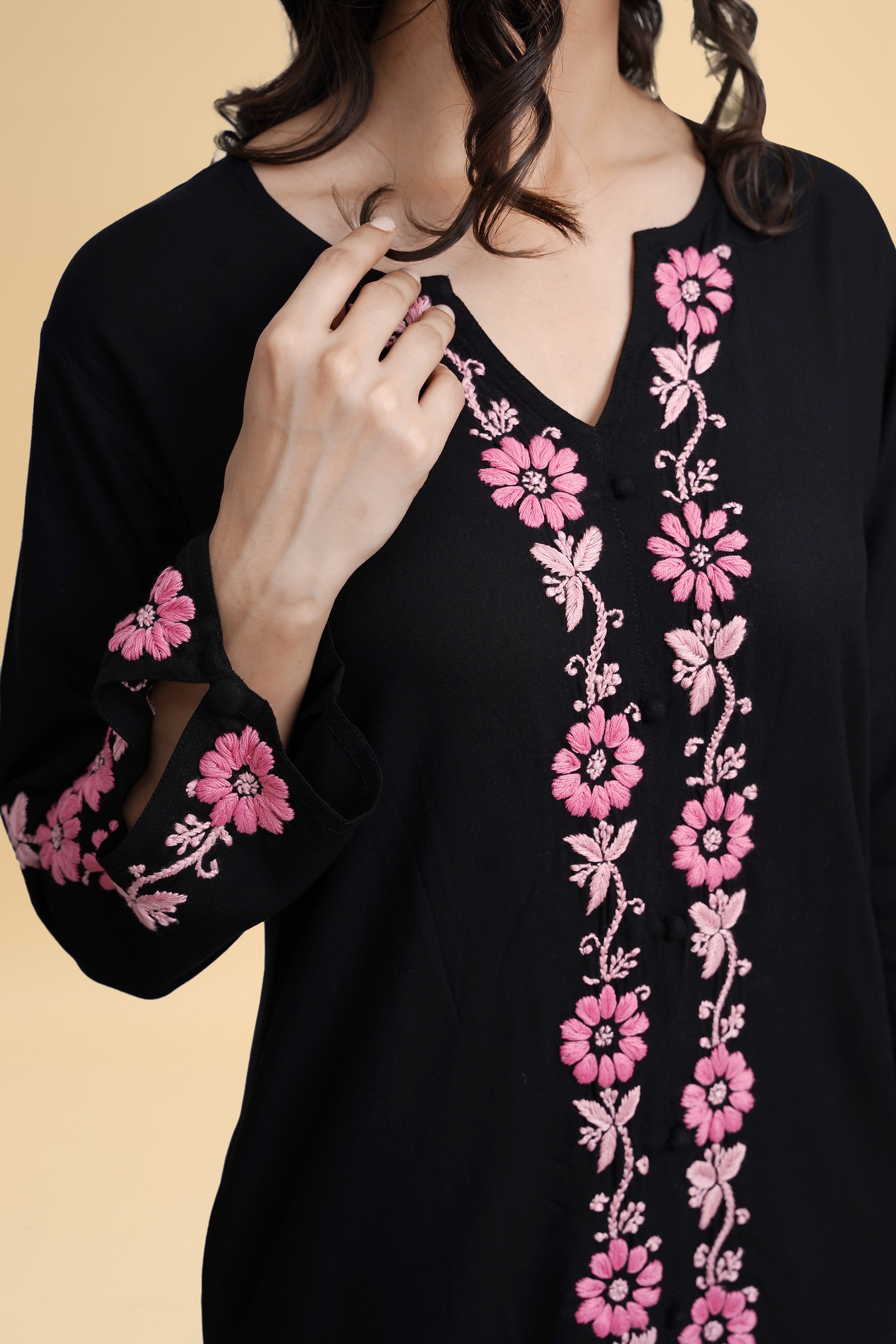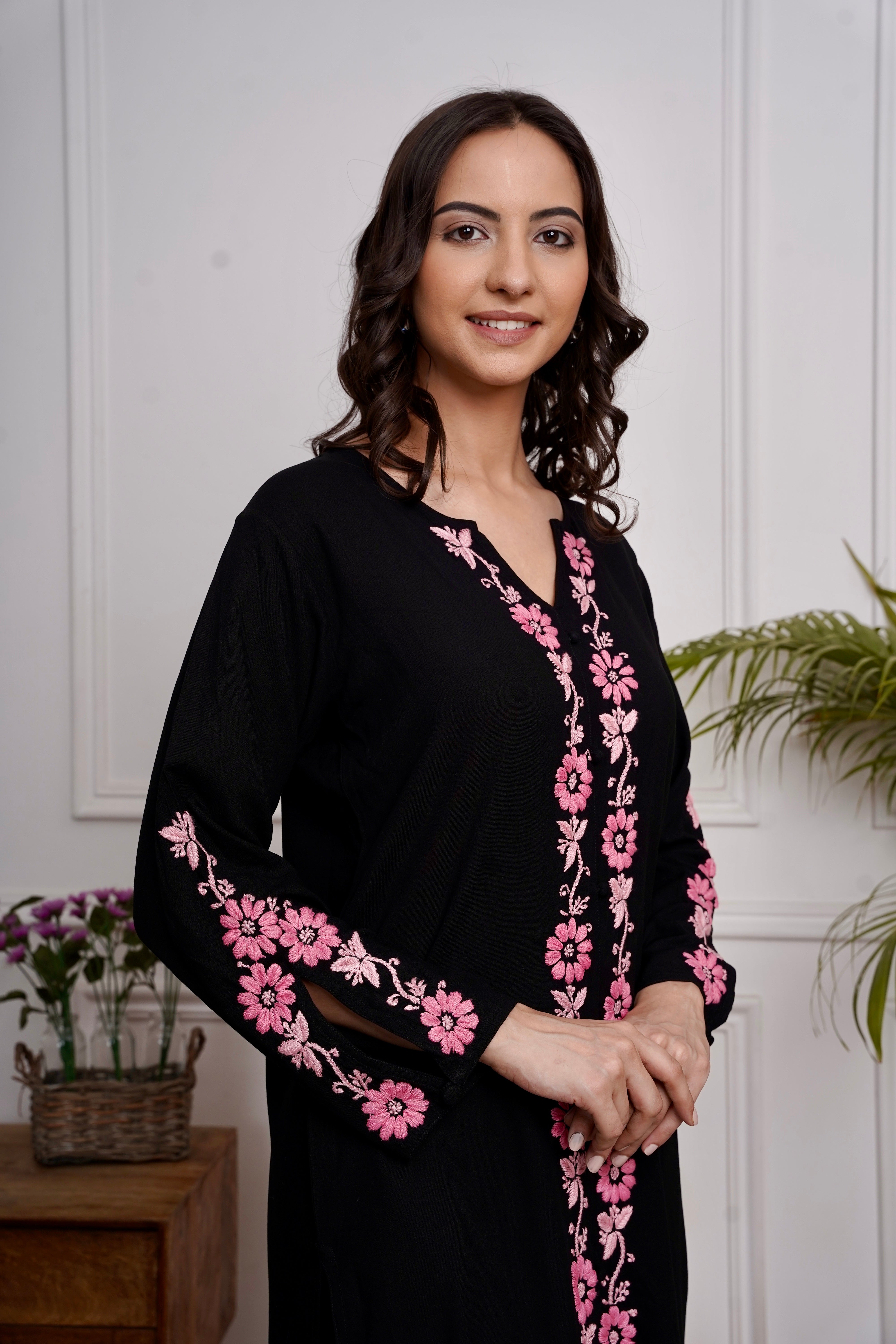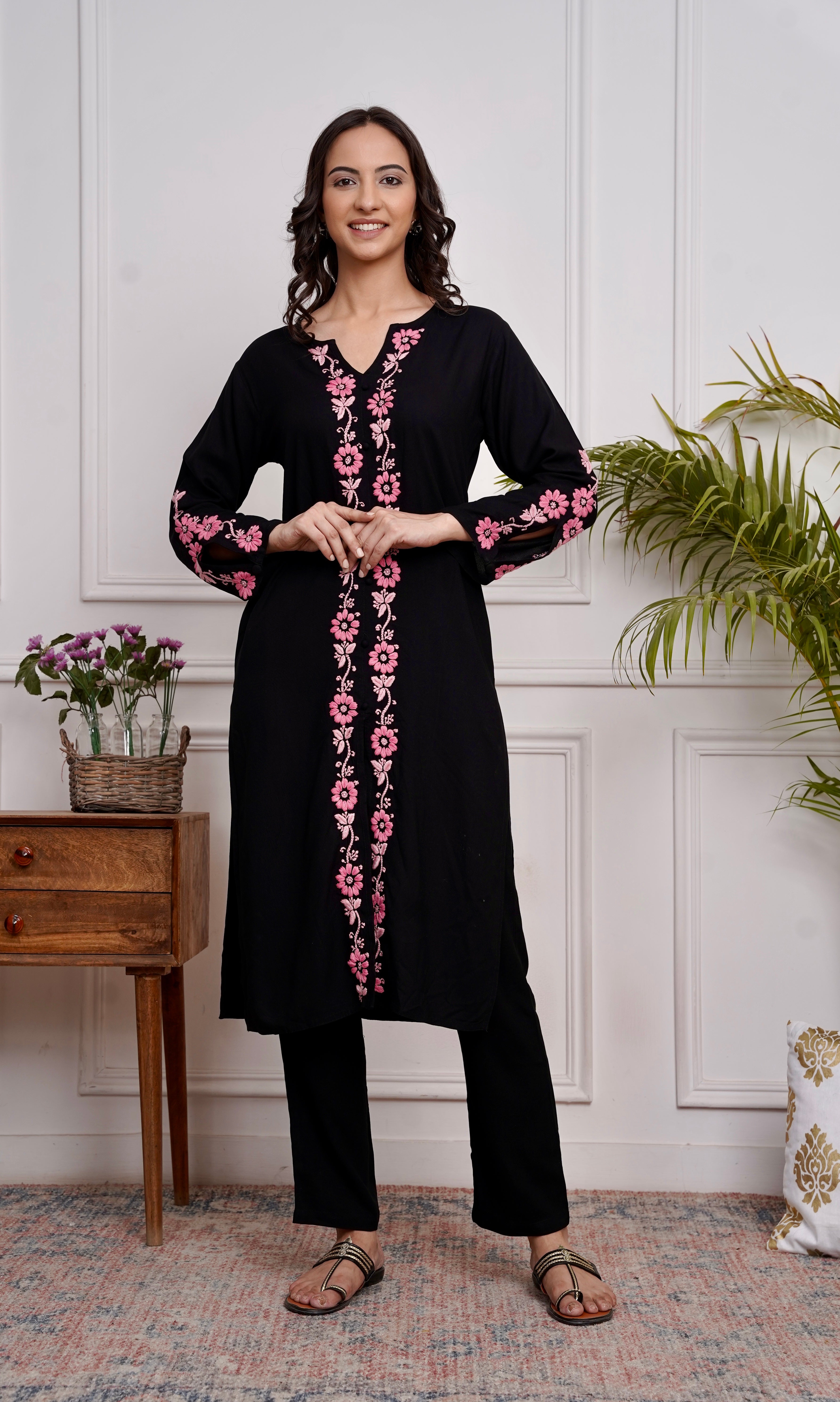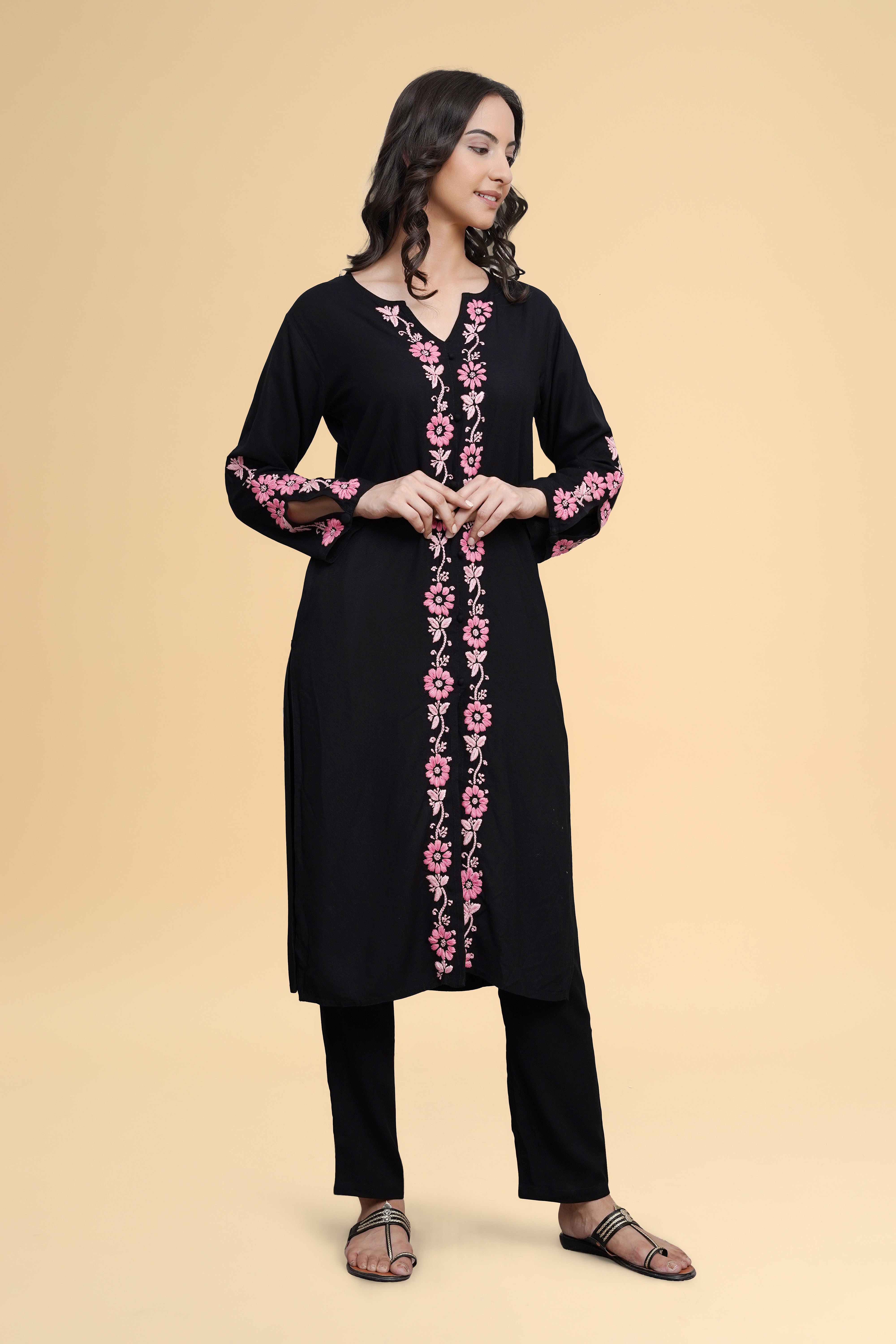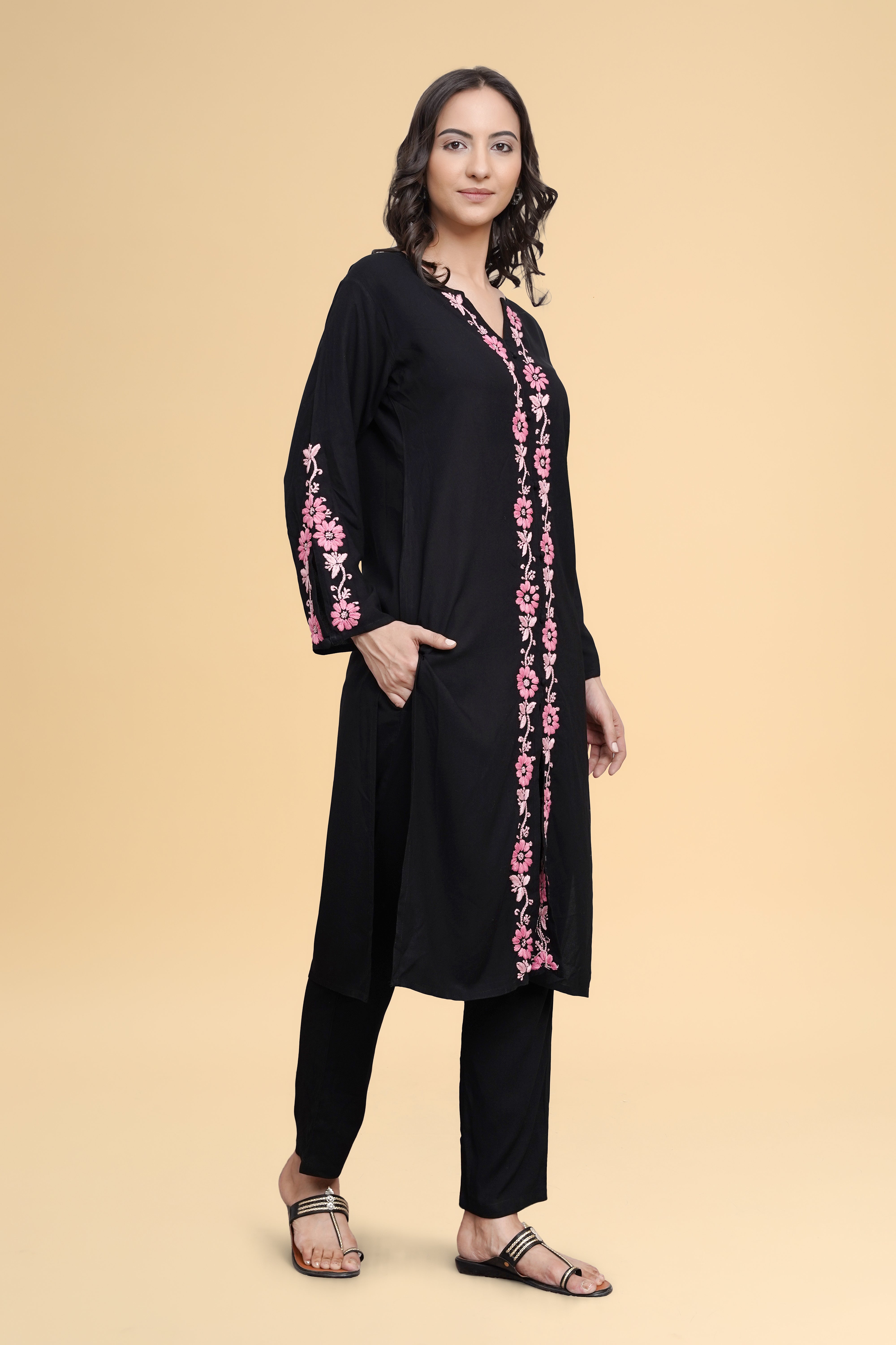 Saba Chikankari Long Kurta in Rayon Cotton - Black
