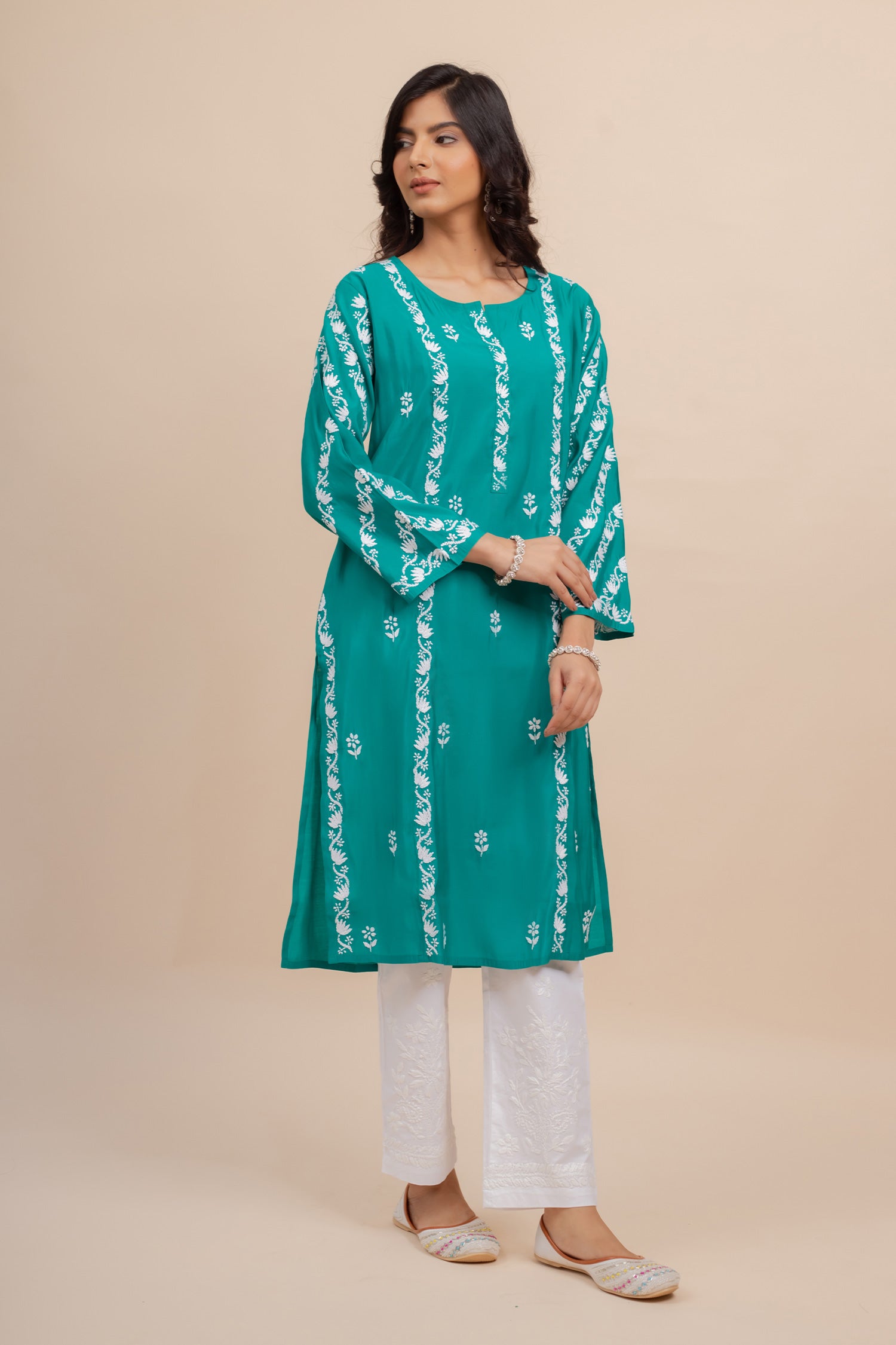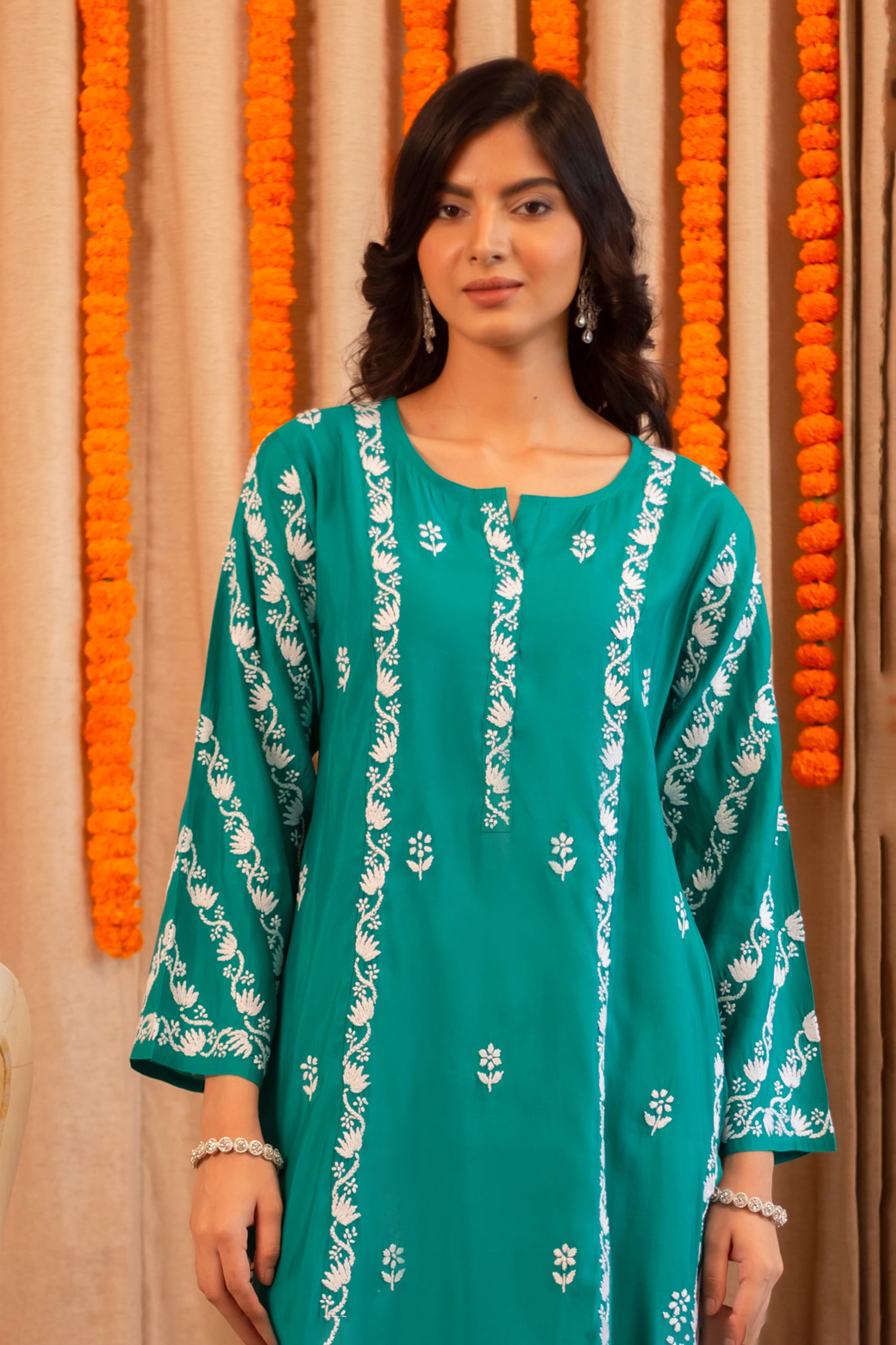 Saba Chikankari Long Kurta In Muslin - Turkish Green