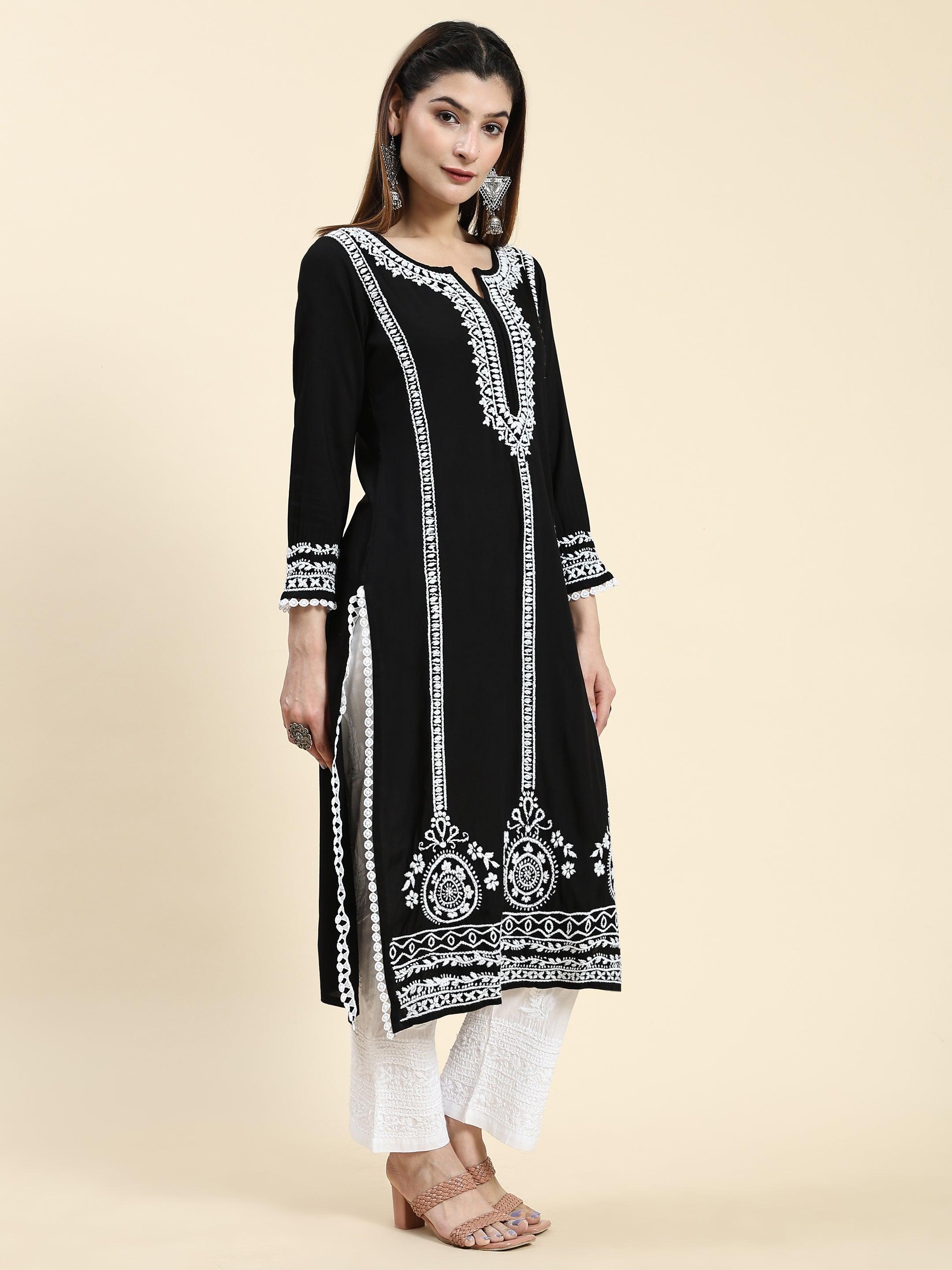 Samma Chikankari Long Kurta in Rayon Cotton for Women- Black With White