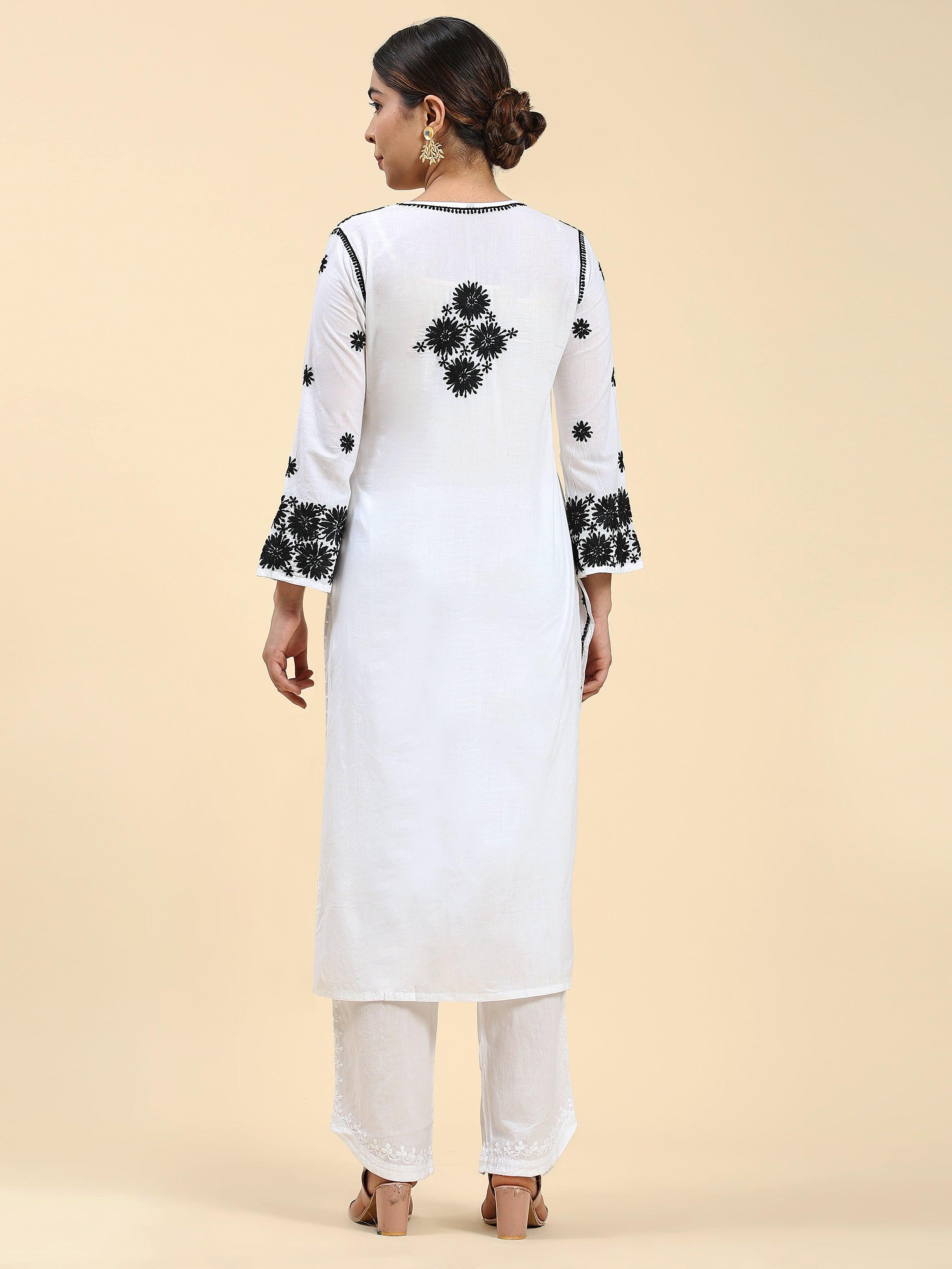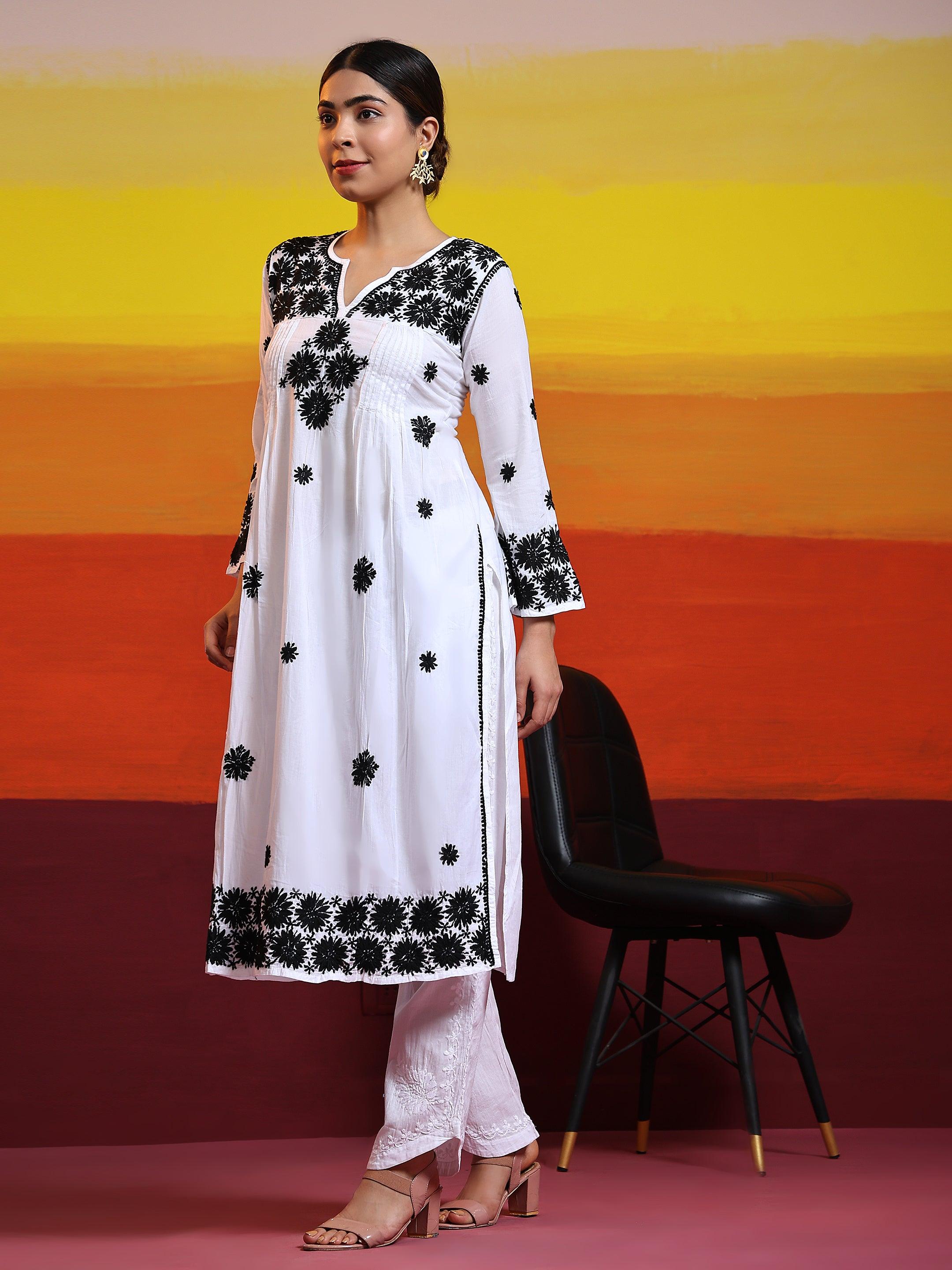 Fizaa Chikankari Long Kurta in Rayon Cotton for Women- White With Black
